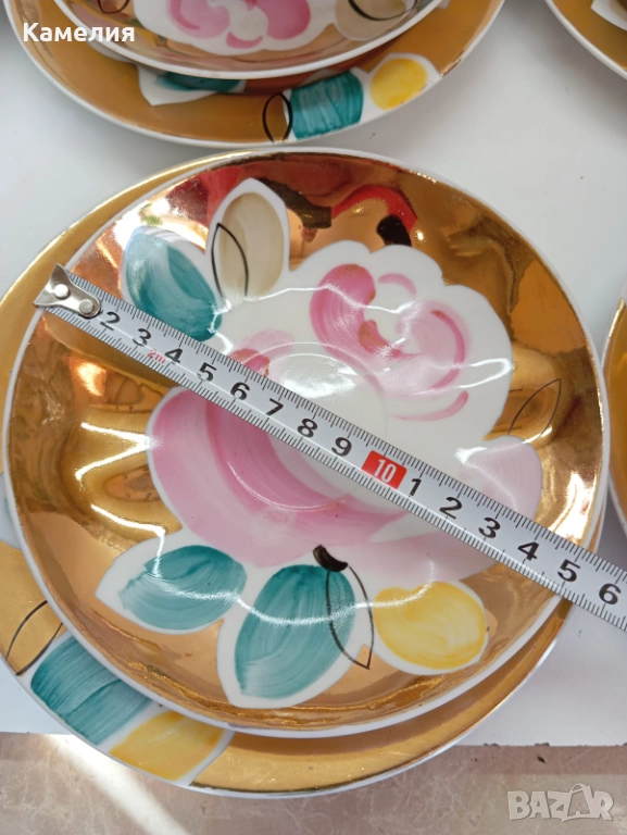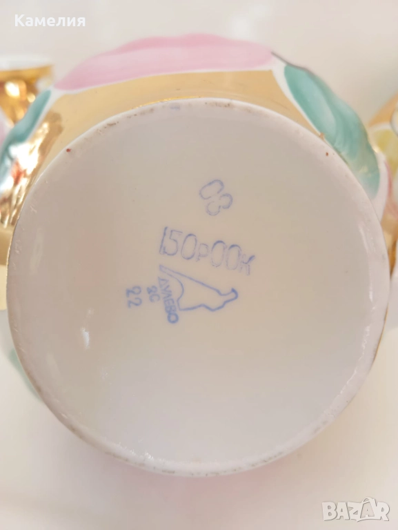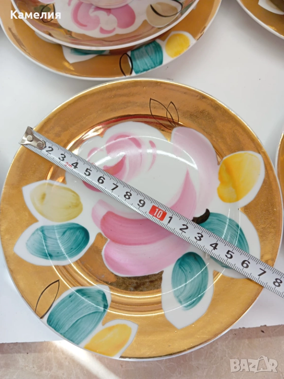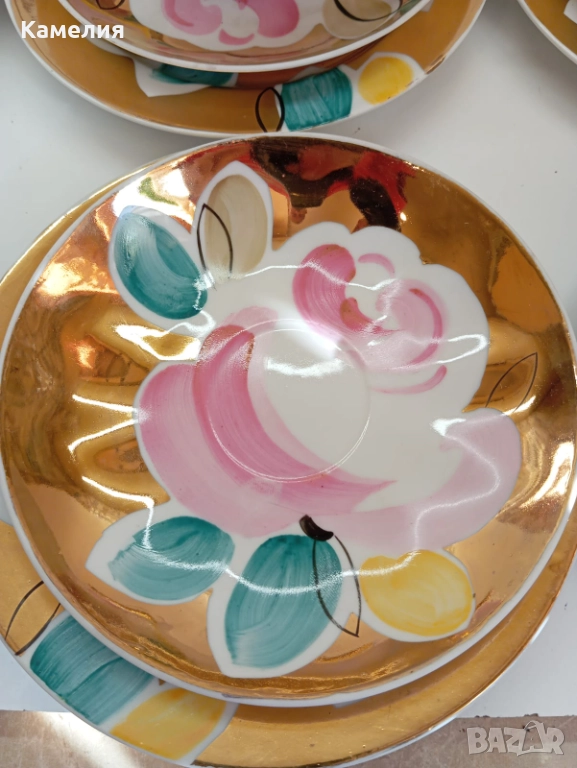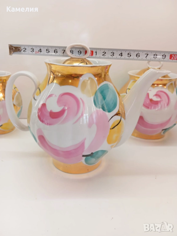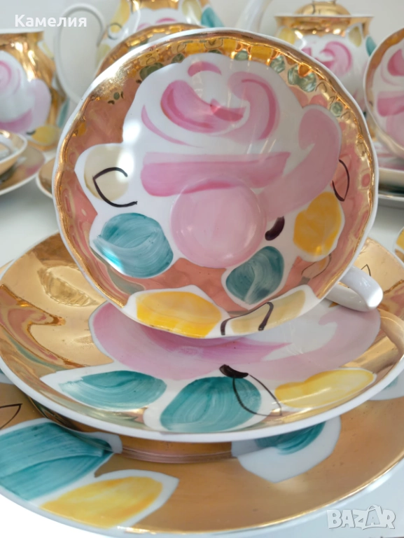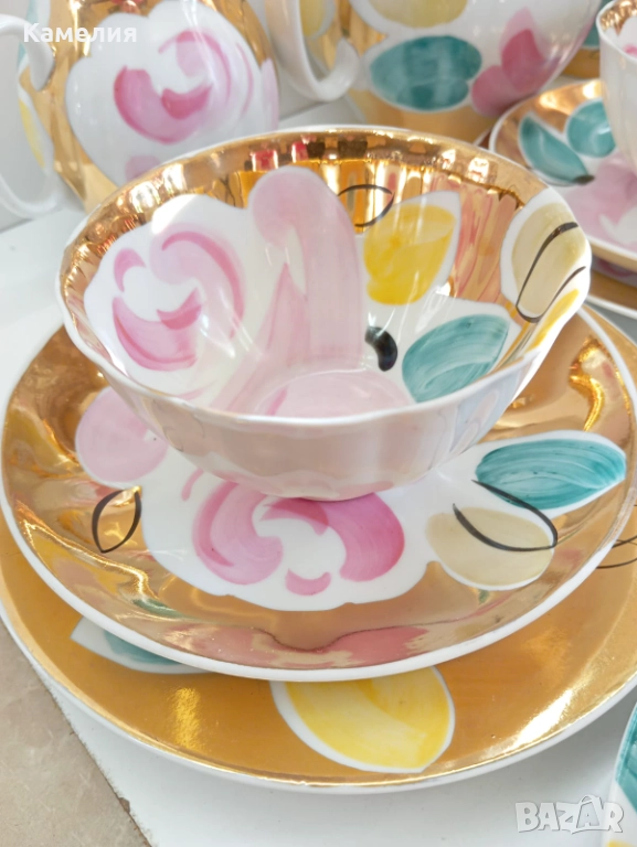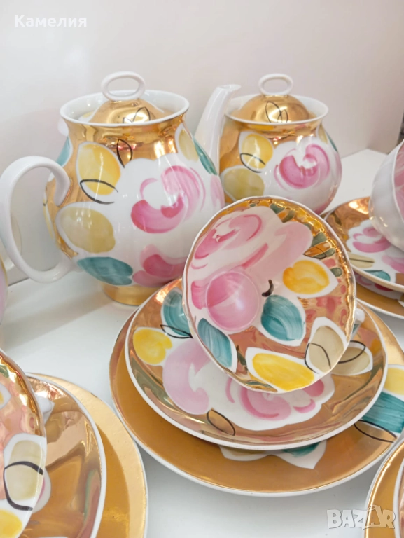 Красив сервиз за чай Златен букет. Дулево. Происход СССР. Форма Бял лебед. Ръчно рисувано. Чайник, захарница, латиера, 6 големи, чаши 280 мл, 6 чинийки, 6 десертни чинии. Много добро състояние за годините. Без чукнато и пукнато, малки фабрични несъвършенства по боя. В СССР сервиз струваше 150 рубла (цяла заплата).