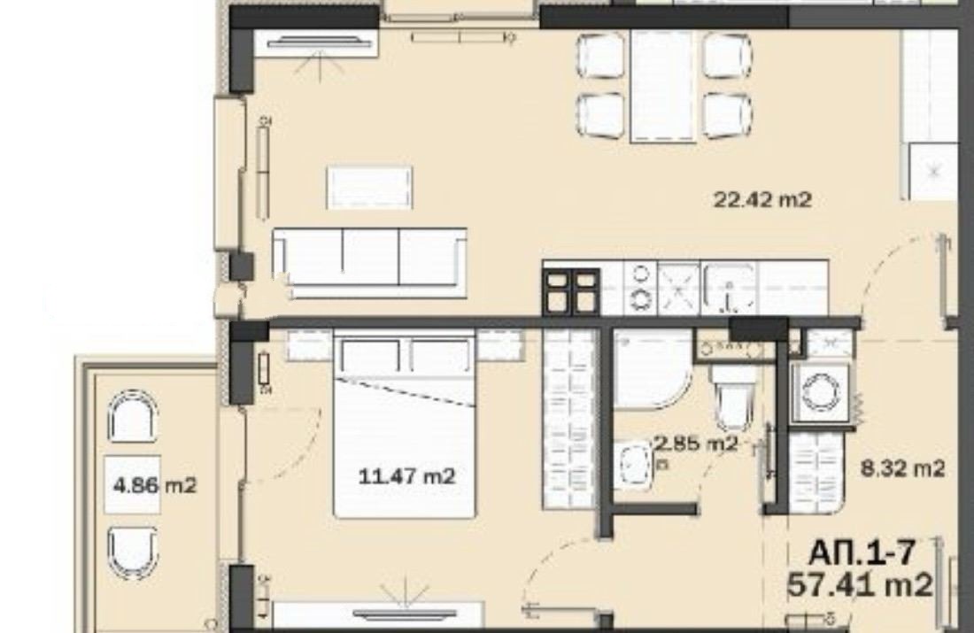 Разпределение: просторна дневна с кухненски бокс, светла спалня, баня с тоалетна, входно антре и слънчева тераса 🛋️🛏️🚿🌞