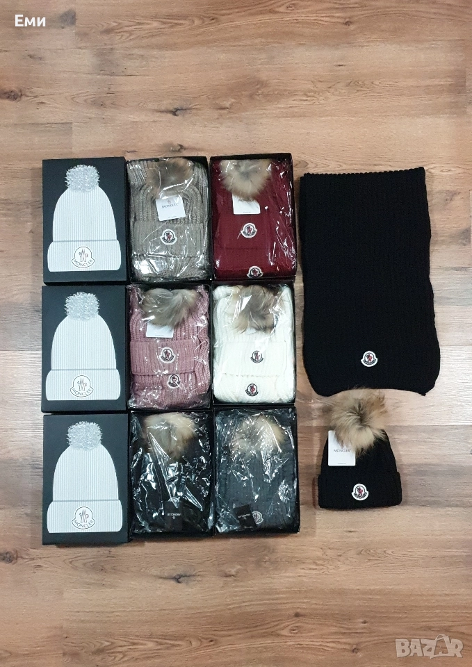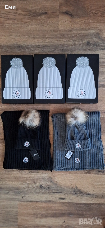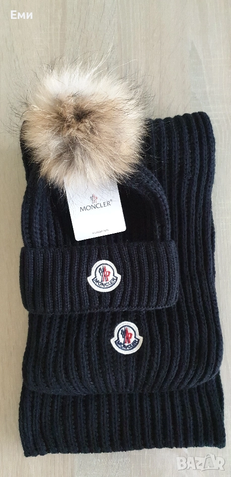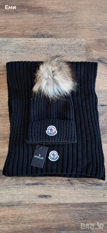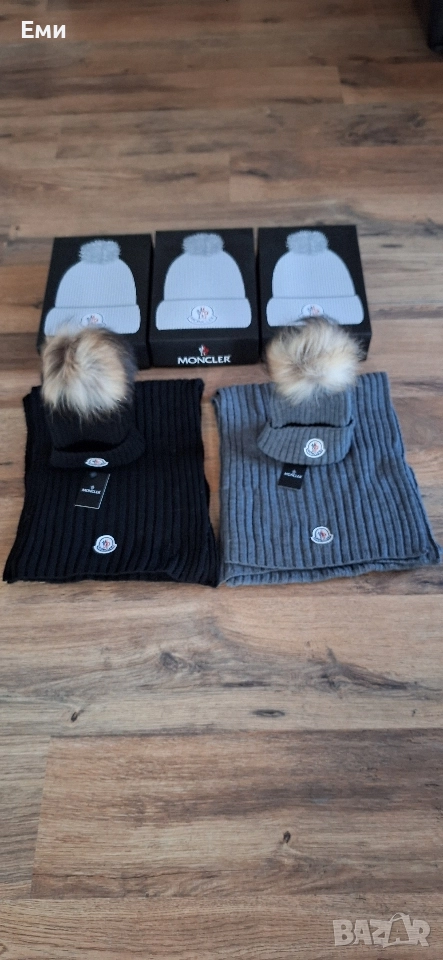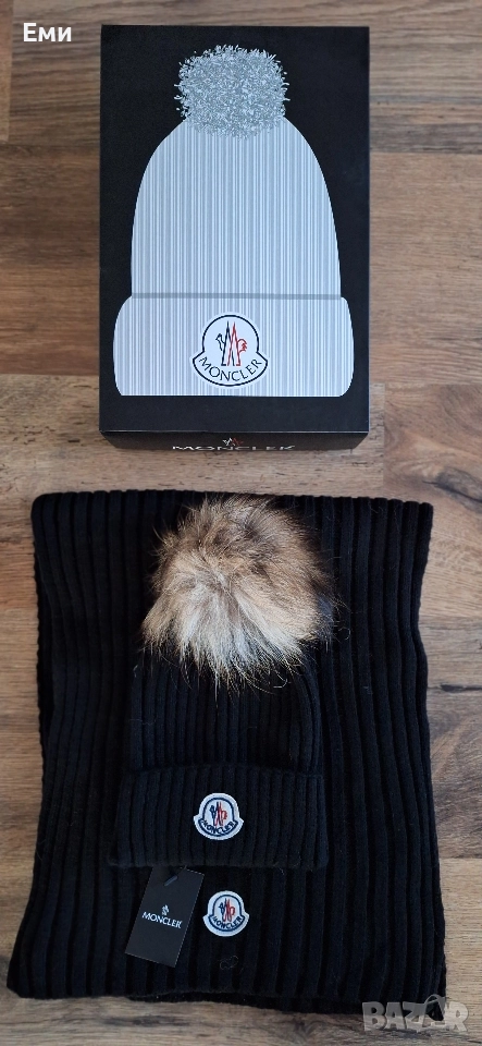 Комплекта шал и шапка на Moncler е в луксозна кутия на цена 80 лева.