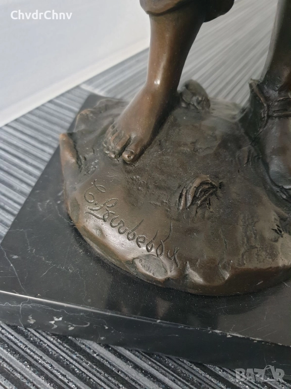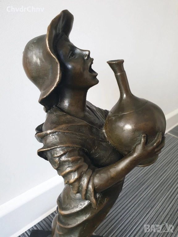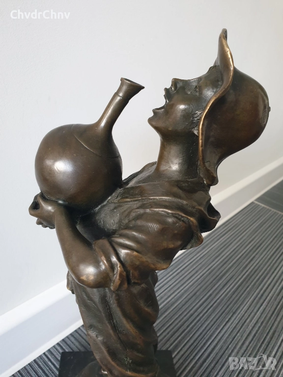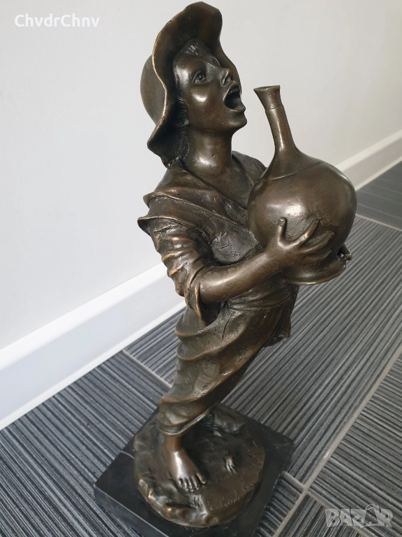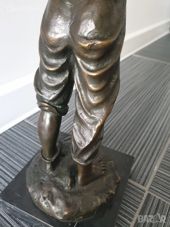 Височина 40 см, тегло около 6 кг, плътен бронз с патина (основата е от черен мрамор с размери 14х14х3 см), детайлна, запазена, стара (Италия началото на 20-ти век), авторска/подписана (показано).