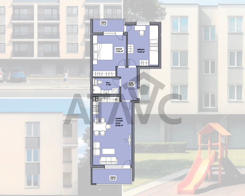 Апартаментът, който Ви предлагаме е с отлично разпределение, подходящ за семейство или за хора, които работят от вкъщи и искат отделно пространство за фокус. Жилището разполага с голяма дневна с място за кухня, трапезария и комфортна зона за отдих, плюс тераса с директен достъп от всекидневната. Спалнята е отделена и осигурява спокойствие, а към нея има собствена тераса. Второто помещение е идеално за кабинет, детска стая или гостна - с правилна форма и достатъчно място за пълноценно обзавеждане. Банята е удобна, а антрето събира пространството логично и без загуби на площ.