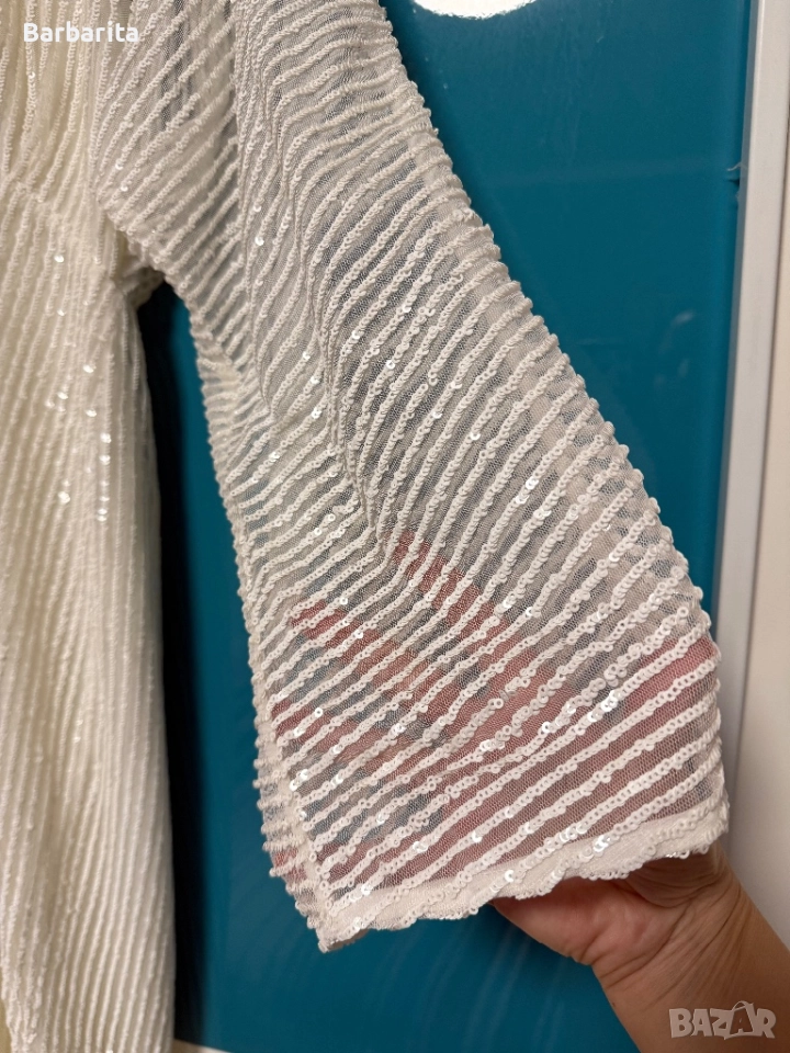 Бяла рокля с пайети размер S/M .Роклята е обличана, но е в отлично състояние.Дължина - 105см, от мишница до мишница- 34см.