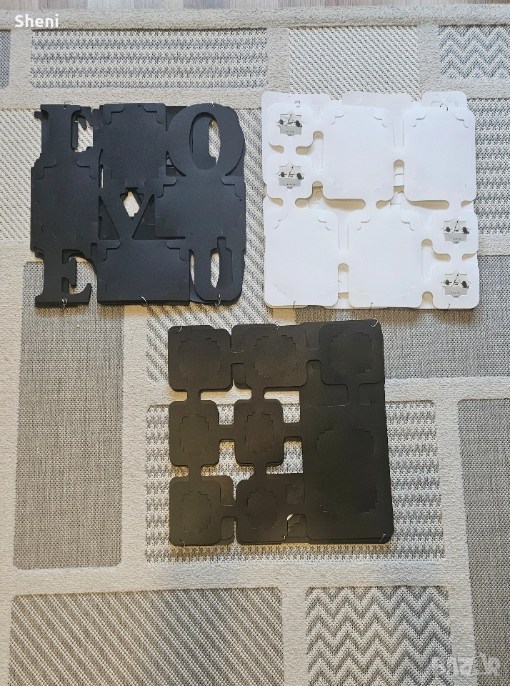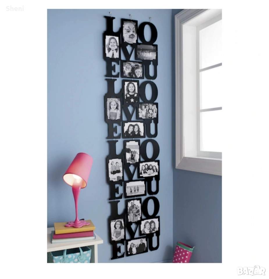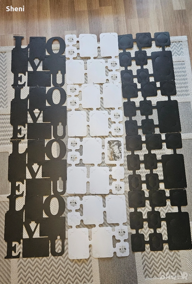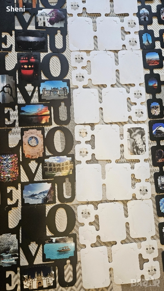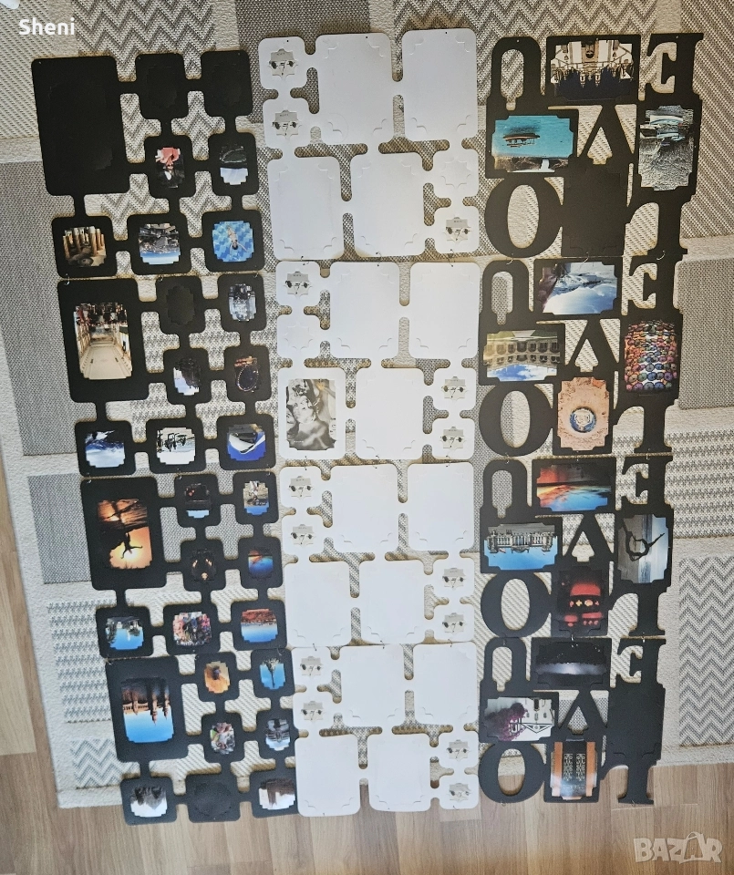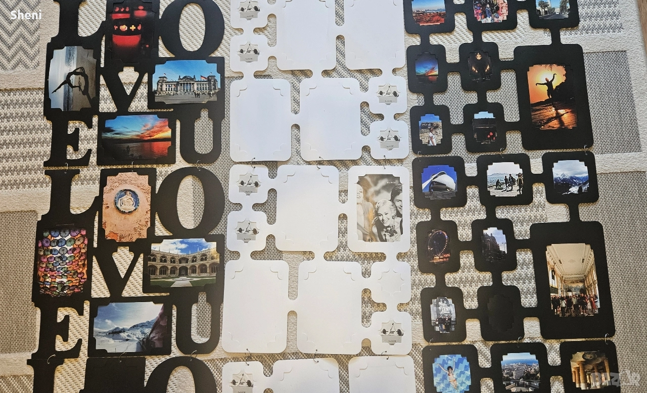 Три броя големи стенни пана за снимки с различни размери на фотографиите. Всяко пано се състои от 4 броя по-малки пана с размери 40х40 см., като две от паната побират по 8 броя снимки, а третото с надпис Love побира по 4 броя големи снимки. В момента паната за стена са сглобени на дължина ( широчома 40 см × дължина 120 см), но може да се преконфигурират вертикално или хоризонтално, квадрат и т.н. Снимките от паната са свалени понеже са личен архив. Снимано е с част от тях, за да се придобие представа. Направете си собствен красив колаж от щастливи спомени. Общо може да поставите 80 снимки в рамките. Материала е пластмаса. Отлично състояние