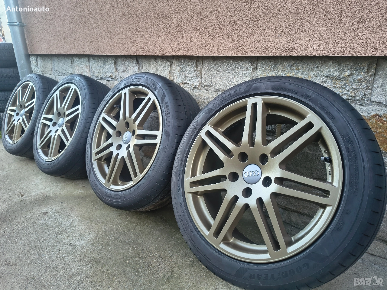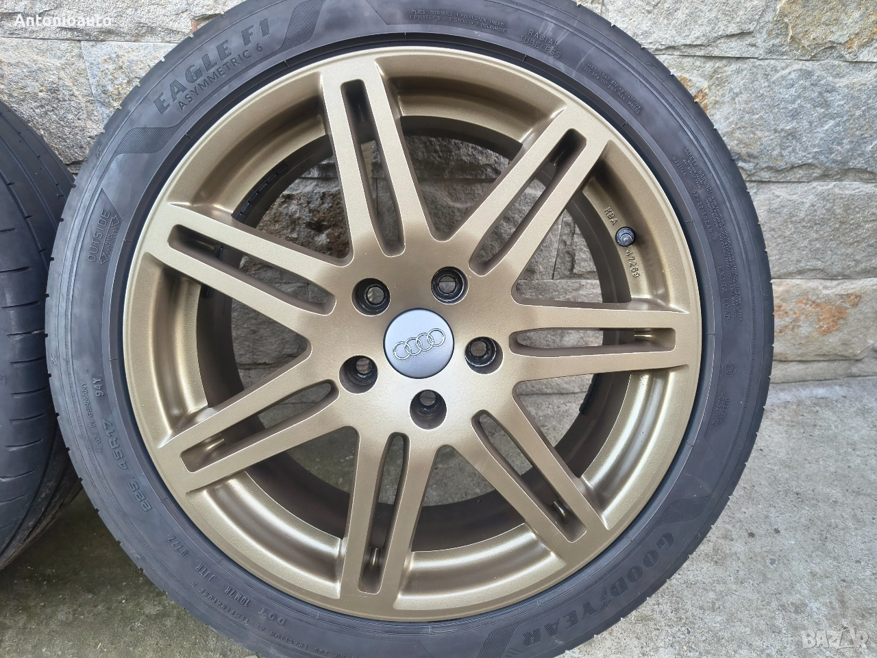 5x112 - 17 цола ЕТ45 / 7,5J Централен отвор 66.6 имат втулки на 57.1. Джанти за audi 17-ки произведени в Германия! Нов внос. Не са карани в Бг. Без кривини, без заварки! Джантите са в перфектно състояние!!! Имат гуми Goodyear