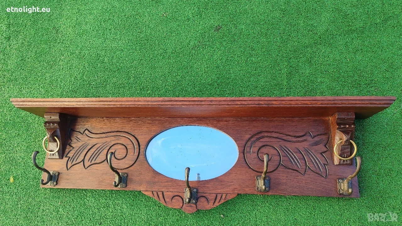 Старинна дъбова закачалка с рафт отгоре, огледало и дърворезба → Обява 52805926
