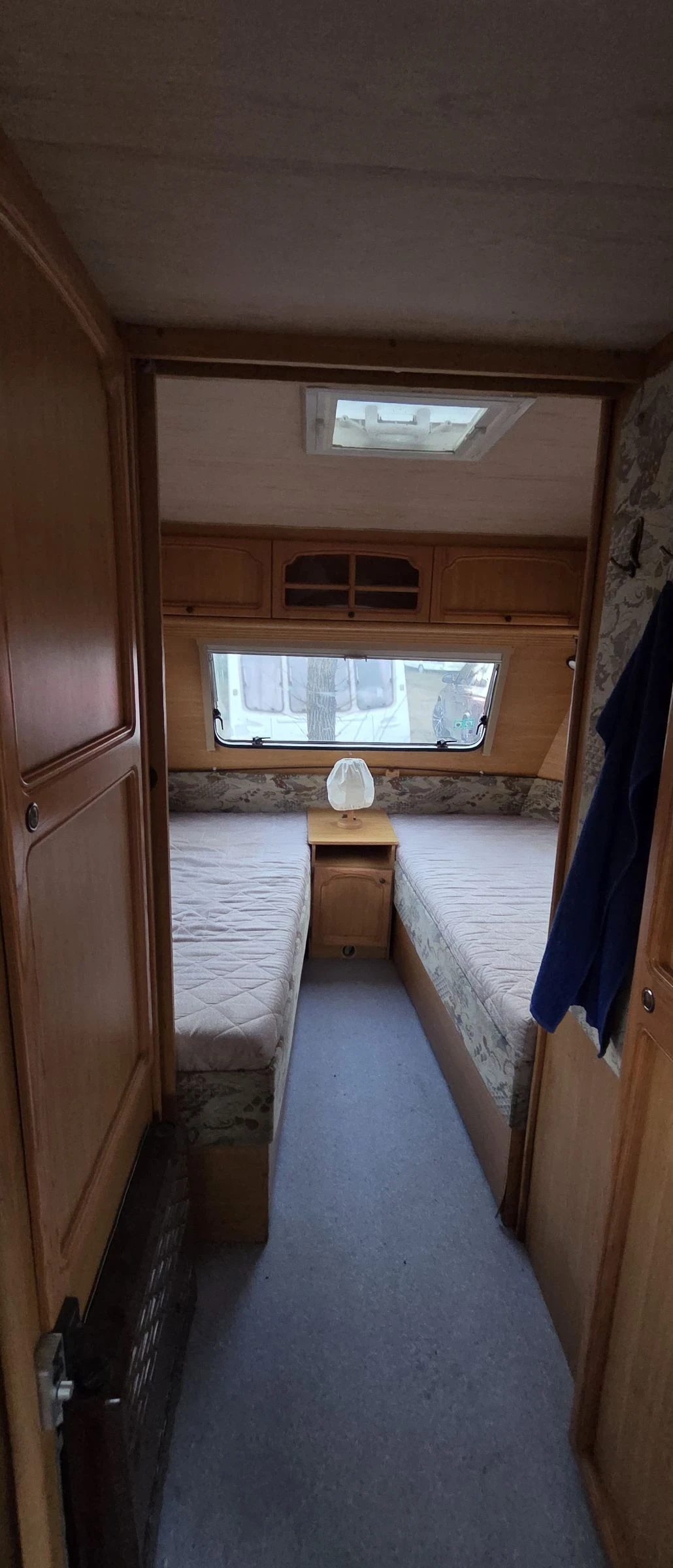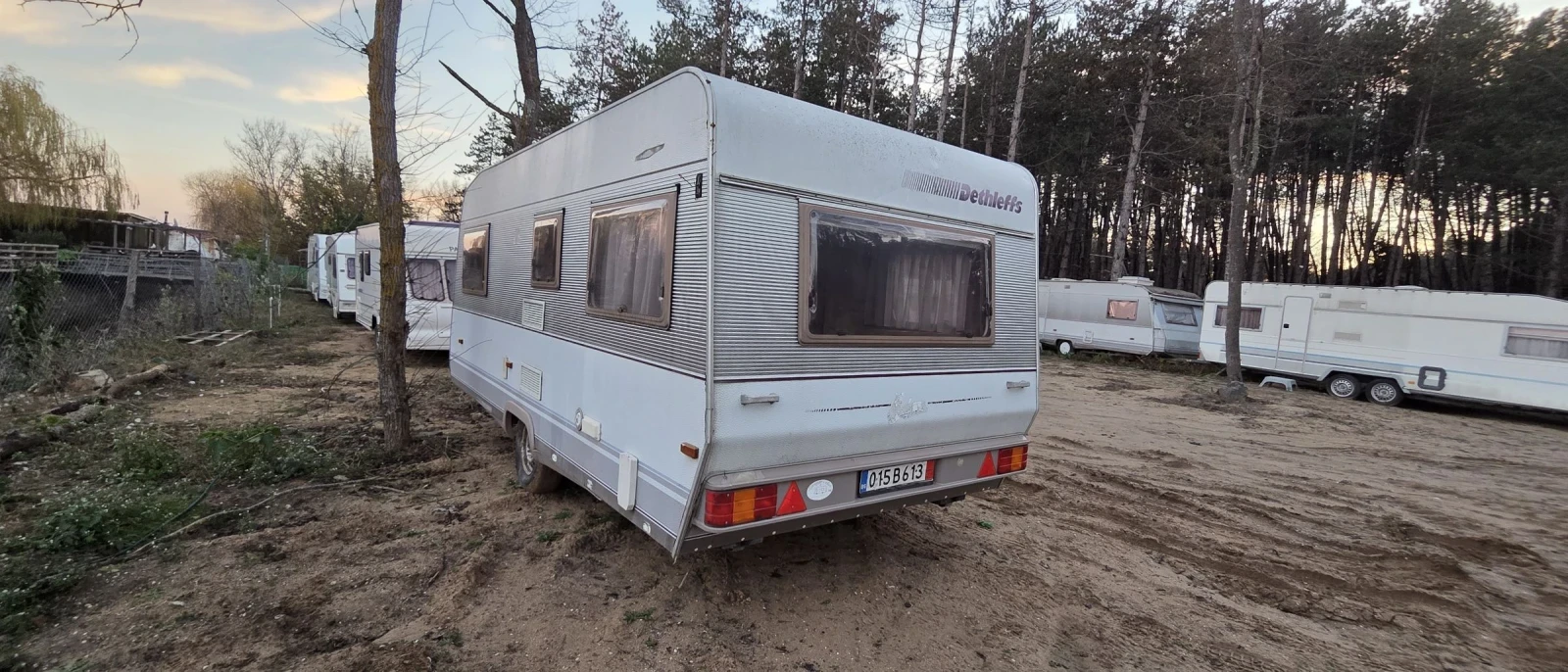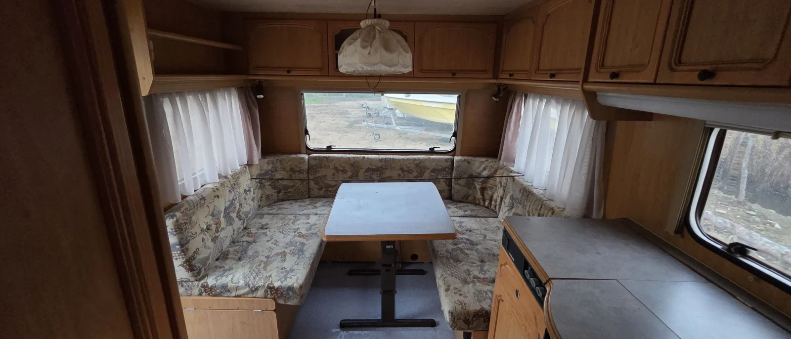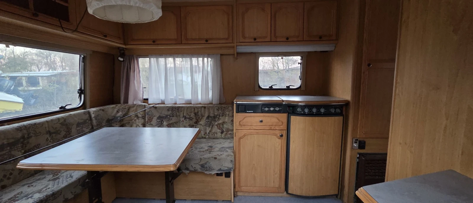 Може да се види в Къмпинг Созопол Еко ПАРАМЕТРИ: - ширина: 2. 25м. - дължина: 5. 20 м (без теглича) - собствена маса: 1100 кг. - максимално допустима маса: 1300 кг. РАЗПОЛОЖЕНИЕ: В задната част двойно сепаре което се трансформира в голямо легло и голямо багажно помещение под него, предната част две единични легла - Брой спални места: 4 бр. Санитарно помещение: - мивка - стационарна химическа тоалетна. - резервоар за чиста вода 60 литра външно пълнене - душ корито КУХНЕНСКИ БОКС: - хладилник Electrolux 12/220v и газ. - мивка - 3бр. котлони на газ. - шкафчета с органайзери за багаж ОТОПЛЕНИЕ: печка на газ с обдухване на цялата каравана. ЕКСТРИ И АКСЕСОАРИ; - 12/220в осветление. - щори на прозорците - резервна гума - манивела за стабилизатори