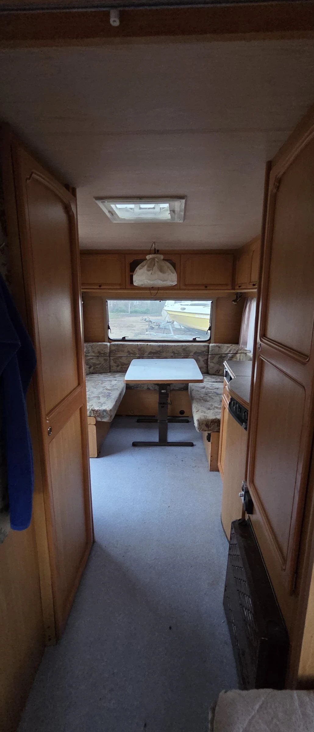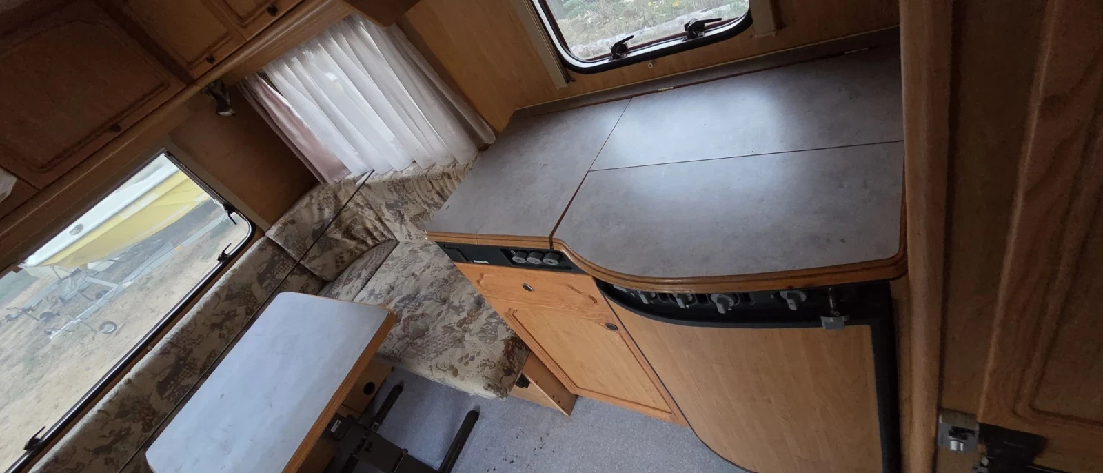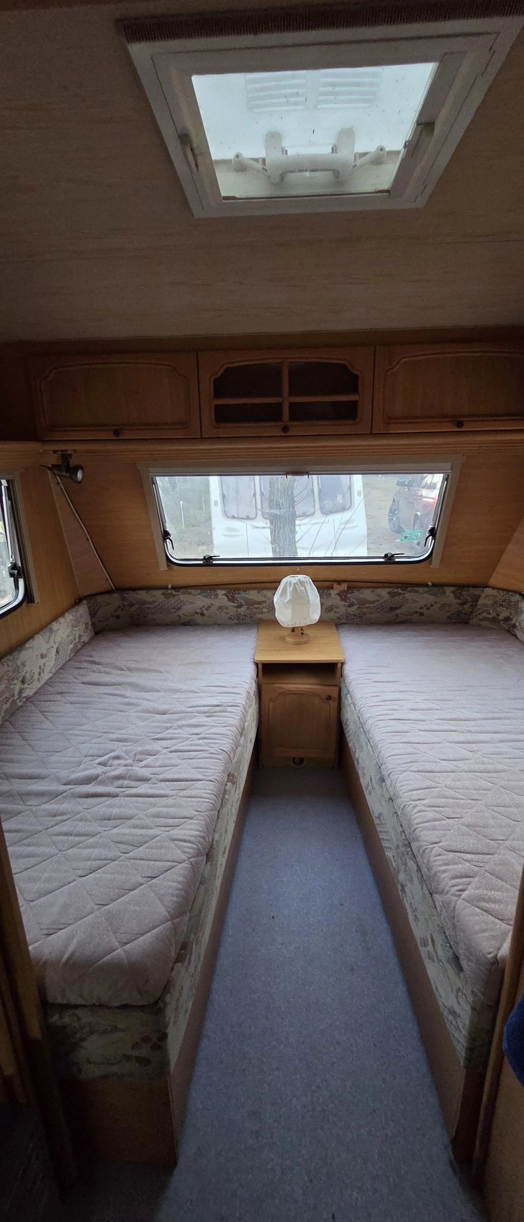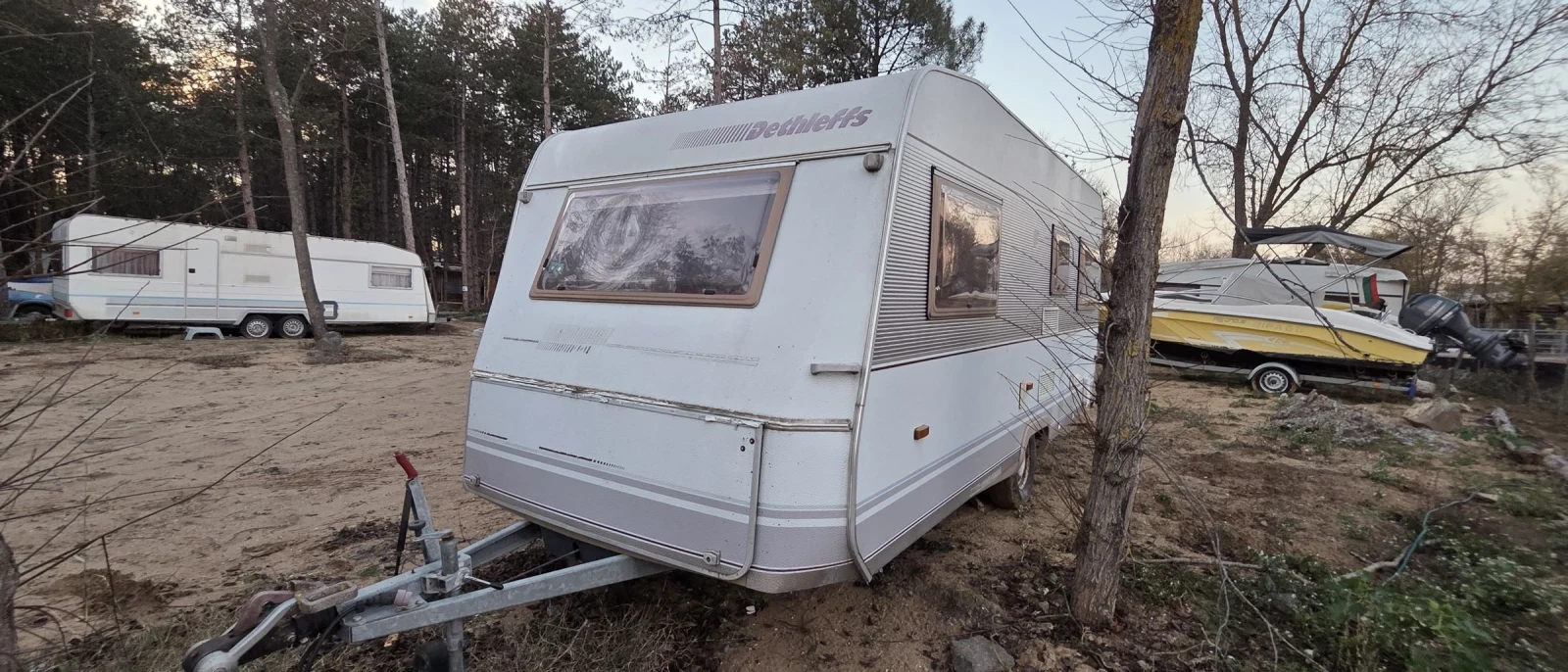 Може да се види в Къмпинг Созопол Еко ПАРАМЕТРИ: - ширина: 2. 25м. - дължина: 5. 20 м (без теглича) - собствена маса: 1100 кг. - максимално допустима маса: 1300 кг. РАЗПОЛОЖЕНИЕ: В задната част двойно сепаре което се трансформира в голямо легло и голямо багажно помещение под него, предната част две единични легла - Брой спални места: 4 бр. Санитарно помещение: - мивка - стационарна химическа тоалетна. - резервоар за чиста вода 60 литра външно пълнене - душ корито КУХНЕНСКИ БОКС: - хладилник Electrolux 12/220v и газ. - мивка - 3бр. котлони на газ. - шкафчета с органайзери за багаж ОТОПЛЕНИЕ: печка на газ с обдухване на цялата каравана. ЕКСТРИ И АКСЕСОАРИ; - 12/220в осветление. - щори на прозорците - резервна гума - манивела за стабилизатори