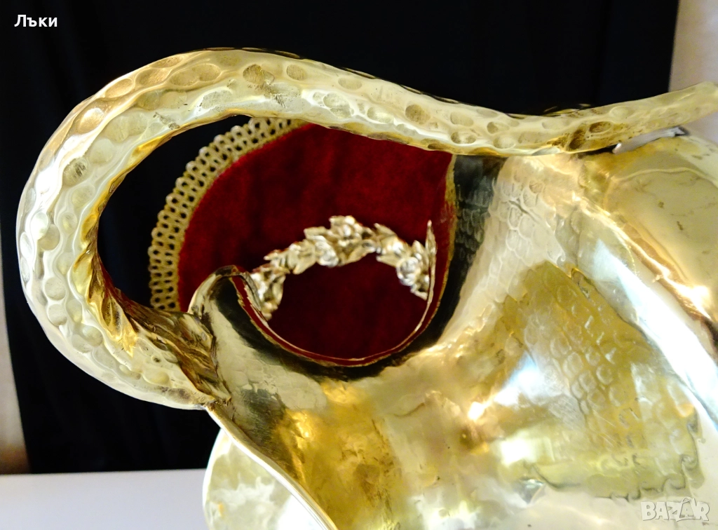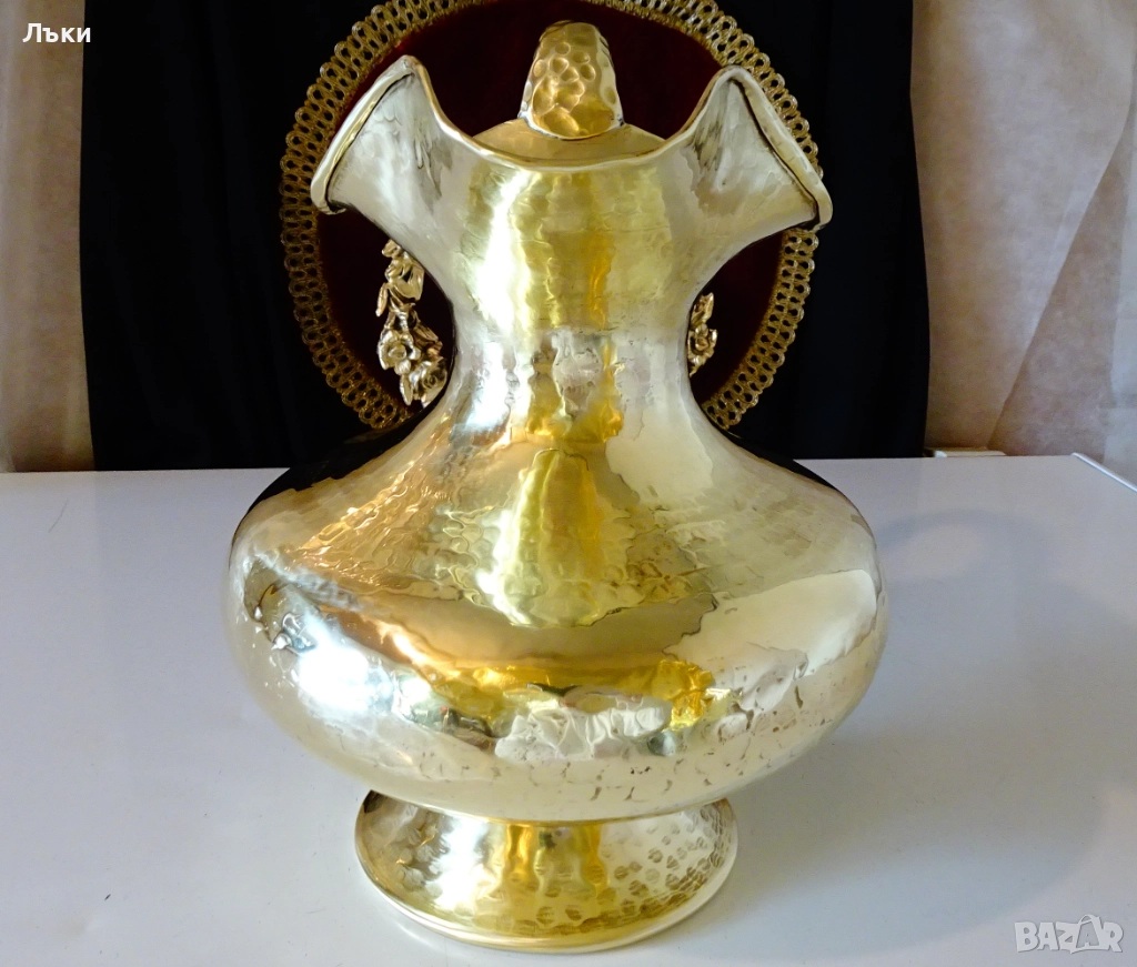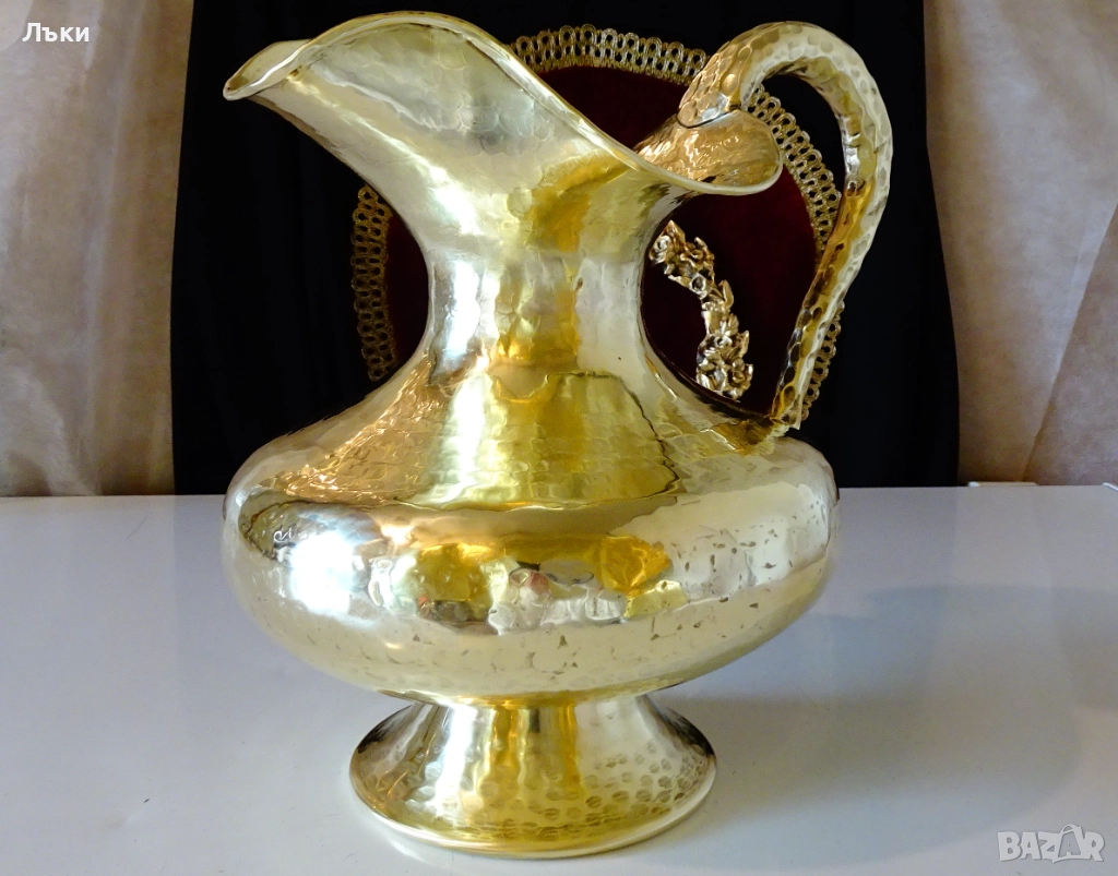 форми,смели извивки,уникално ефектна дръжка и ситно кован релеф.Кана шедьовър,истинско