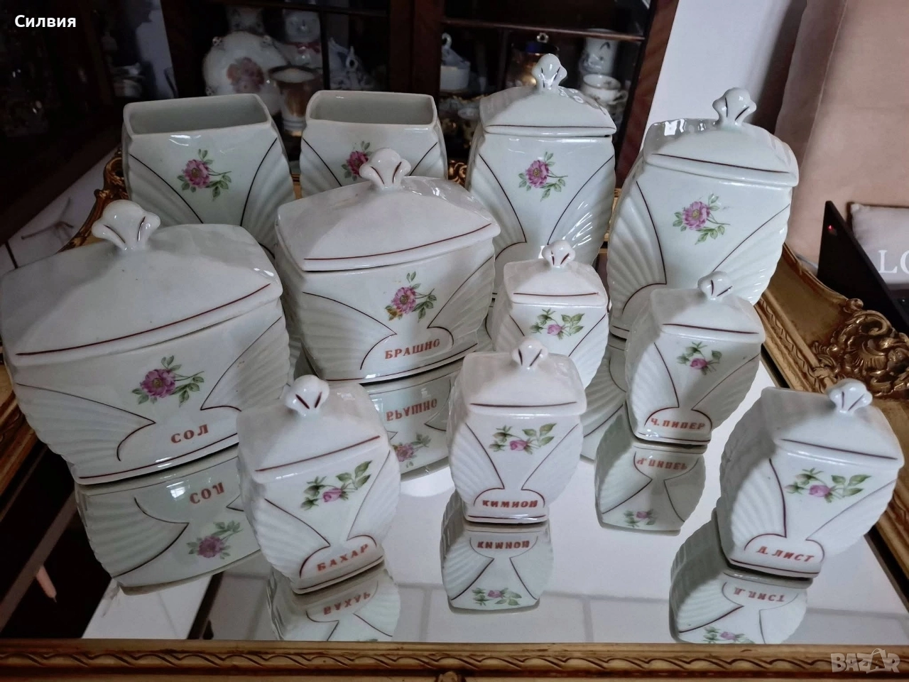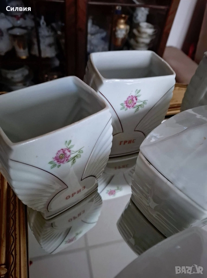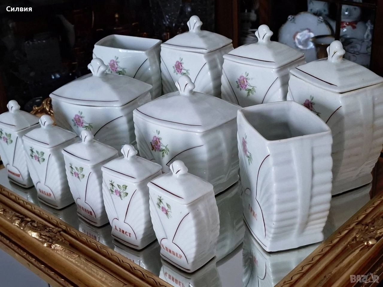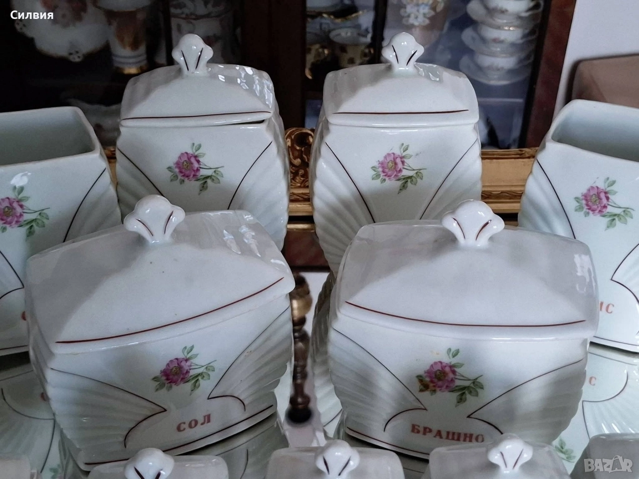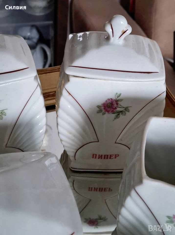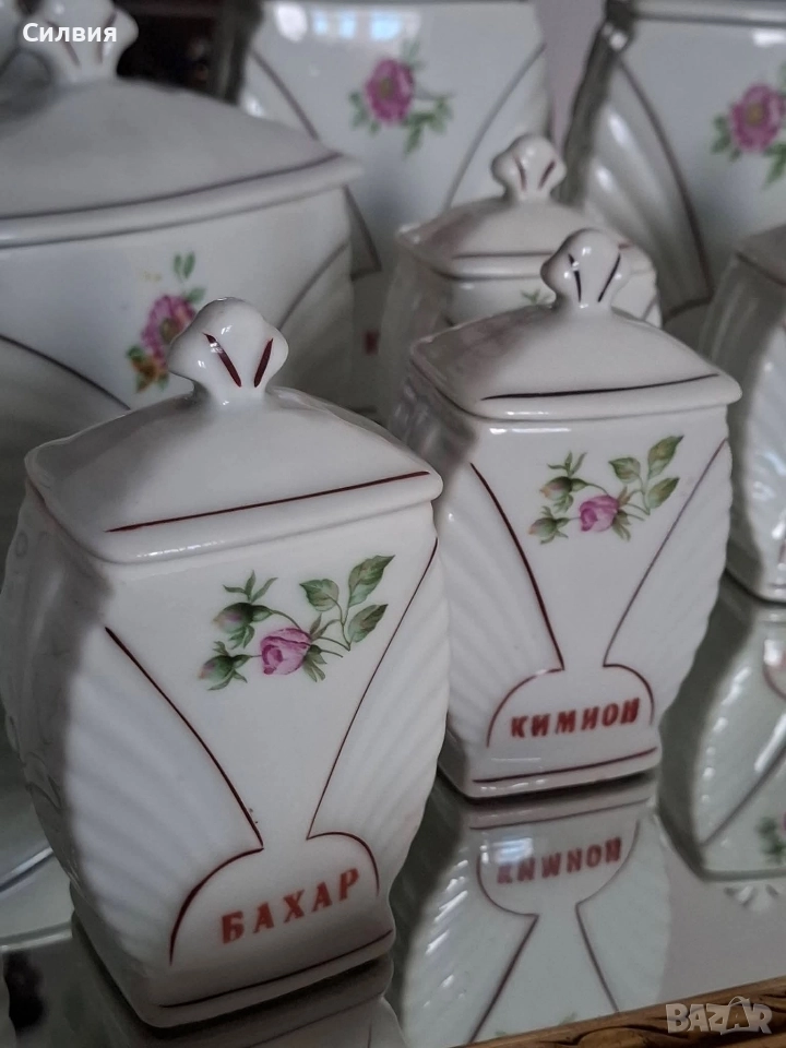 порцеланови буркани за подправки, произведен в България. Този прекрасен сет е чудесно допълнение към всяка кухня или колекция от винтидж порцелан. Отличава се с фин бял порцелан, елегантна релефна шарка и нежни декорации от розови рози. "Производство на Порцеланова фабрика Видин (позната като "Сталин" или "Коста Йорданов"), винтидж порцелан от средата на 20-ти век." Цена 9️⃣0️⃣лв.(46,01 €)•✽✧✽•°”˜🦋”°•✽✧✽•°”˜🦋”°•✽✧✽•°”˜🦋”°•✽✧✽•°”🦋˜”°•✽✧✽• Като цяло са в много добро състояние, но някои имат леки забележки.