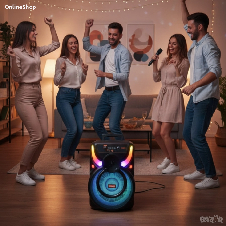 Вграденото FM радио, възможността за микрофон (според комплекта) и цветните RGB LED светлини превръщат колоната в малка мобилна сцена — идеална за караоке, игри, празници и дори за работа като аниматор.