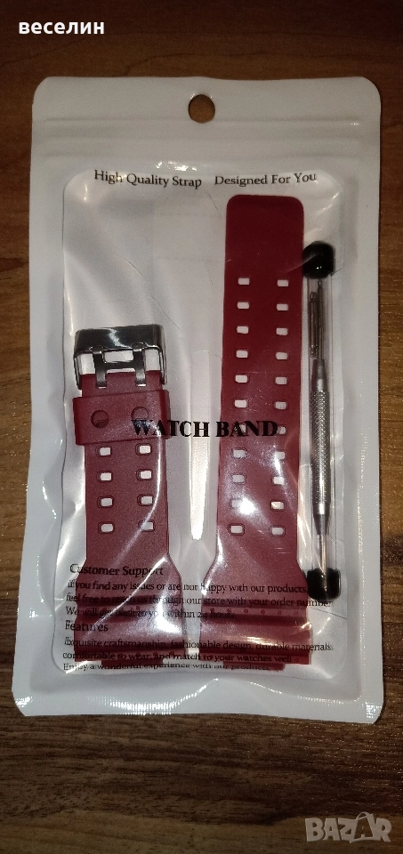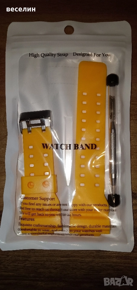 Чисто нова каишка за часовник Casio GA100 и съвместими с него модели /Casio GA-110р Casio GA-120, Casio GA-700, Casio GA-900/. Подарък три патента и инструмент за монтаж на каишката. Цвят червен и жълт. Цената е за комплект
