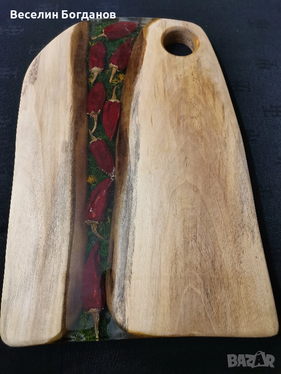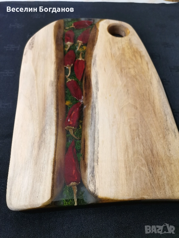 Дъската е изработена от масив орех и кристална епоксидна смоласъс заляти люти чушлета Обработена е с масло за дърво Осмо top-oil