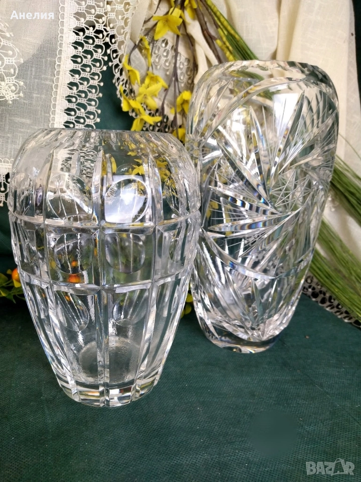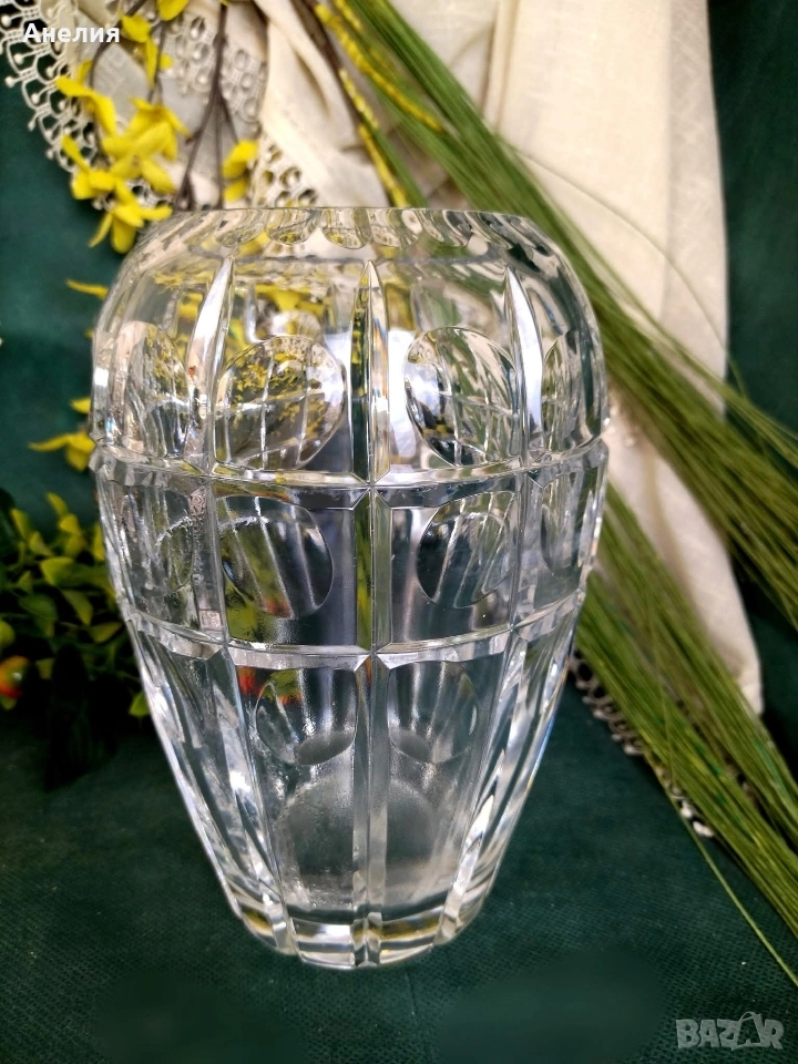 Дизайн: Вазата се отличава с квадратни панели и кръгли "камео" изрязвания, които създават интересен оптичен ефект.