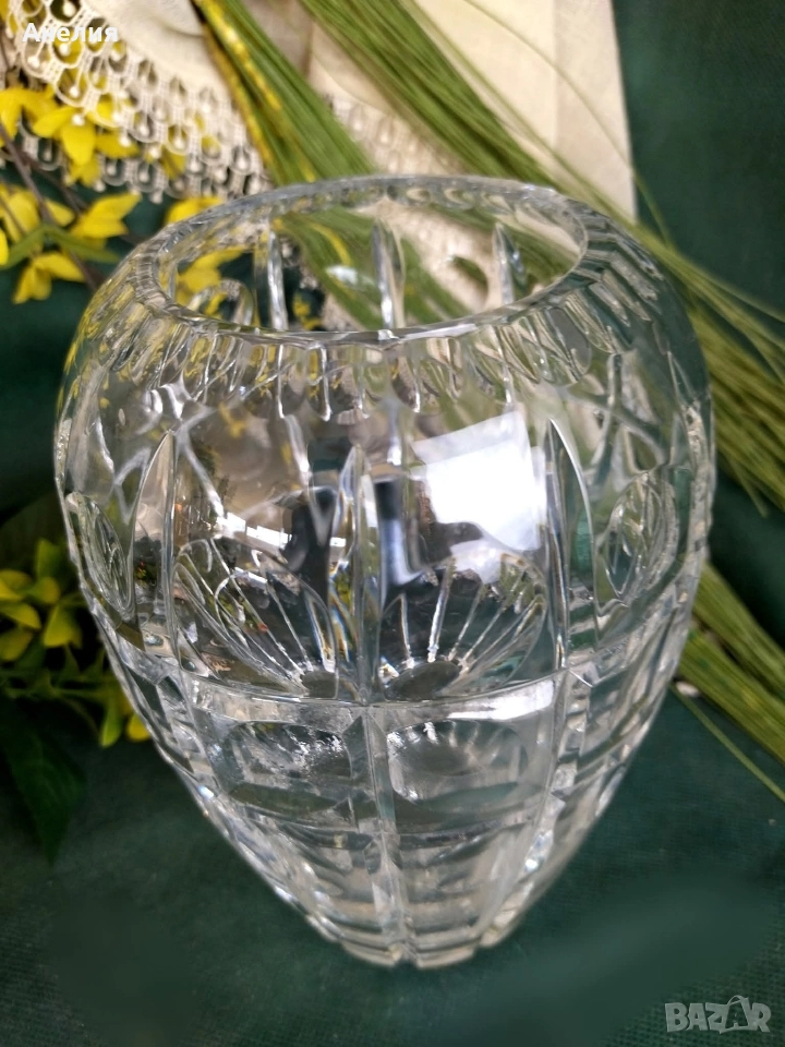 Кристалната ваза на изображението е моделът "Quadrata" на марката Marquis by Waterford.