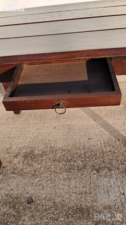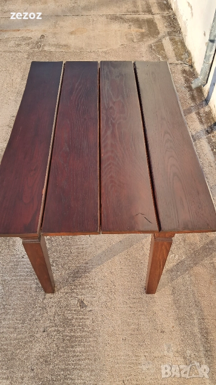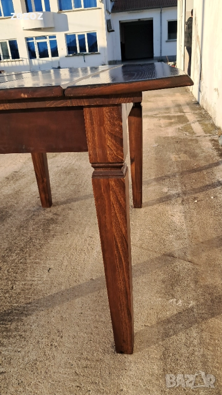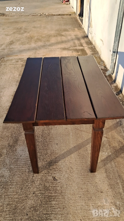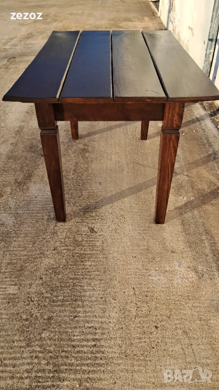 Трапезна маса пълен масив-дъб.Масата е по-различна.Плота най-вероятно е правен допълнително от дебели дъски,като ръбовете на двете дълги страни са обработени вълнообразно,за да създат илюзия за износване.Вижда се на снимките.Също така крайните дъски имат дъга това също е снимано.Краката се свалят.Масата е с две чекмеджета.Поради тези особенности само лично предаване.Размери-