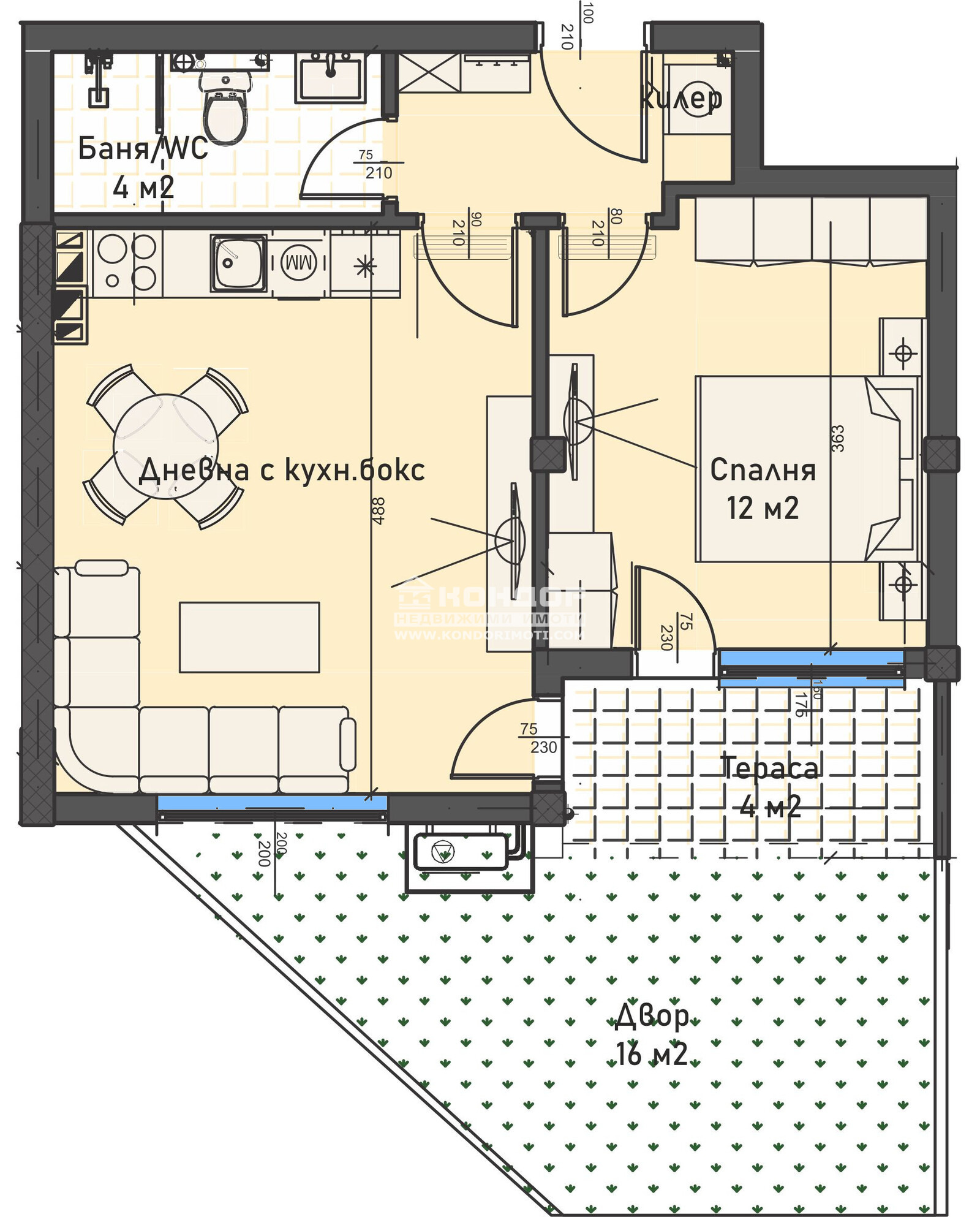 Оферта 68517 - Бутиков затворен жилищен комплекс с модерна и устойчива архитектура, потопена в богато озеленени площи, вдъхващи на живущите комфорт и спокойствие. Комплекса предлага просторна спокойна среда с бърз достъп до центъра на града, както и възлови булеварди. Предлагаме ви двустаен апартамент с изяло южно изложение, състоящ се от дневна с трапезария и кухненска част, самостоятелна спалня, баня с тоалетна, входно антре с място за перално, една веранда и двор. В близост са ситуирани ресторанти, хипермаркети, училища и детски градини. Луксозно изградени общи части с предоставено облагородено дворно място, пейки за отдих и детски площадки за игра. Апартаментите ще се издават на: