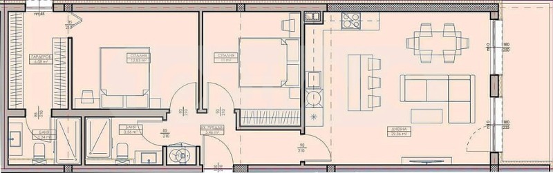 Разположен на втори етаж от девет, светли и просторни стаи с правилни форми и следното разпределение: антре, светла и просторна всекидневна 29.4 кв.м. с излаз на тераса с източно изложение, спалня 11 кв.м., втора спалня 13 кв.м. със собствен санитарен възел и дрешник 6 кв.м., както и втори санитарен възел.