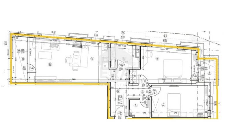 Апартаментът е с площ 109.72 кв.м., разположен на трети етаж от общо единадесет. Състои се от дневна със светъл кухненски бокс си излаз към балкон, спалня с балкон, втора спалня, баня с тоалетна, коридор и складово помещение. Изложението е изток/запад/север. Всички апартаменти се издават с ниско-температурно (29-31?) подово отопление и охлаждане/климатизация с конвектори към хибридна термопомпа на газ и ток с индивидуално котле на газ. Подовото отопление е във всяка стая и санитарно помещение. Лири от висок клас в санитарните помещения.