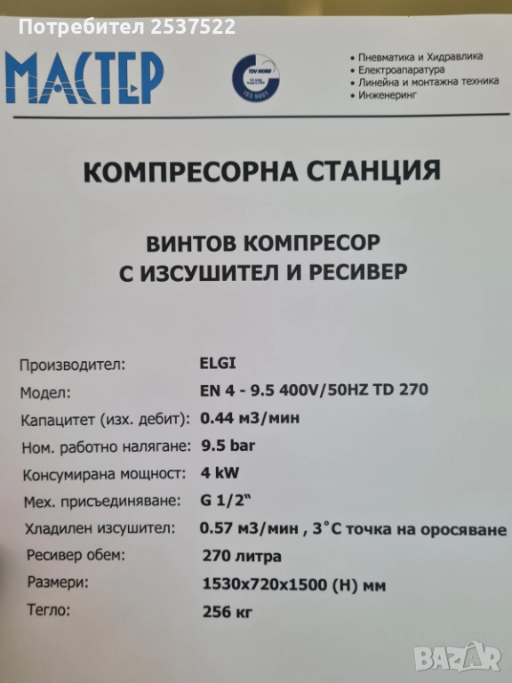 Компресор винтов ELGI 4 kW с ресивер 270 л и изсушител, снимка 1 - Други машини и части - 52810774 Компресор винтов ELGI 4 kW с ресивер 270 л и изсушител, снимка 2 - Други машини и части - 52810774 Компресор винтов ELGI 4 kW с ресивер 270 л и изсушител, снимка 3 - Други машини и части - 52810774 1/3