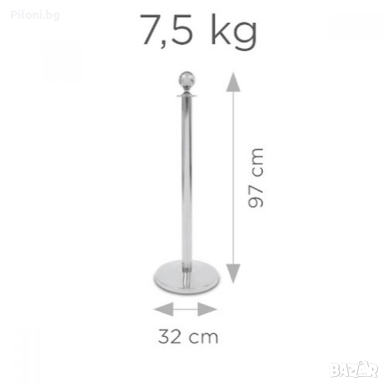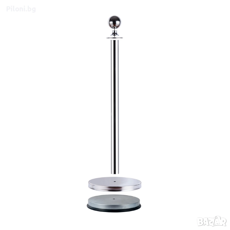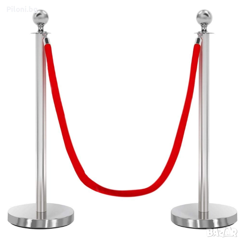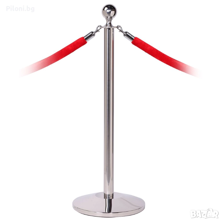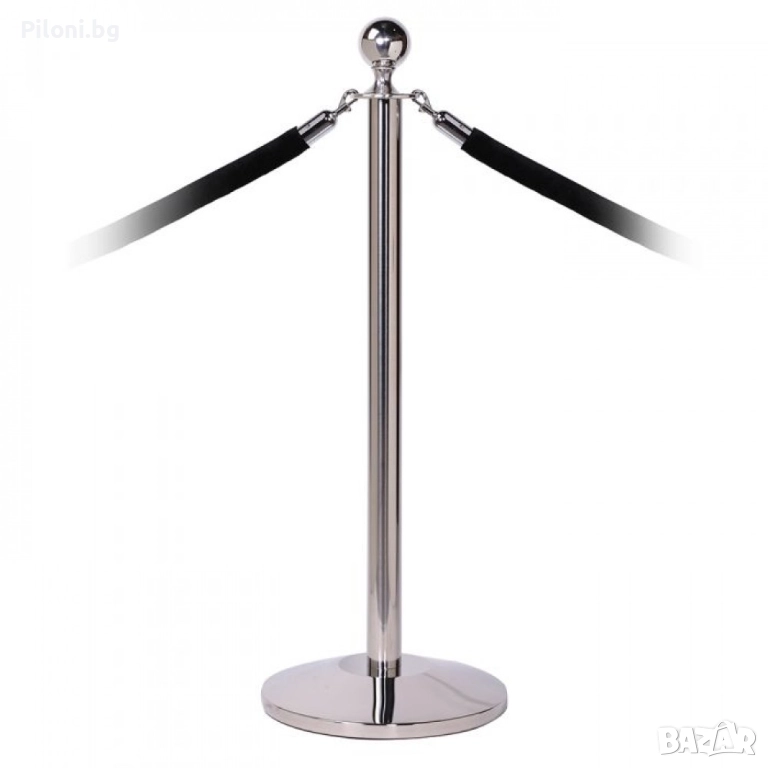 Стабилено и елегантено сиво(хром) метално ограничително колче с въже с цвят по Ваш избор. Въжето може да бъде червено, черно, синьо или трикольорно - бяло, зелено и червено. Въжето е велурно с иноксови самозатварящи се куки и се закача за следващото ограждение. Стоперите могат да бъдат свързани в произволни форми. Произведени са от полирана стомана, издръжливи и лесни за почистване. С помощта на тези ограждения ще може да ограничите определена зона или да забраните достъп до нея, както и да използвате огражденията за указване на посоката в зали, ресторанти, банки, хотели, конференции и събития и други мероприятия. Дължината на въжето е 150см. Височината на колчето е 95 см. с диаметър на основата - 32 см., дъното е полимерно, не се пързаля дори и при мокър под. Тегло - 6.5 кг. Предназначени са предимно за вътрешна употреба.