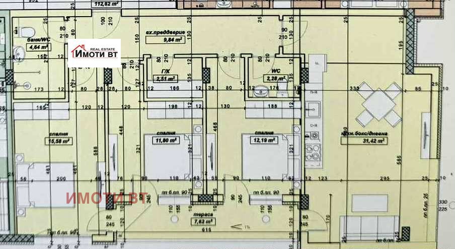 ИМОТИ ВТ продават четиристаен апартамент в новострояща се луксозна сграда. Апартамента се състои от просторна дневна с трапезария и кухненски бокс, три големи спални, коридор, баня и тоалетна, отделно тоалетна, тераса, на която се излиза и от четирите стаи и мокро помещение.