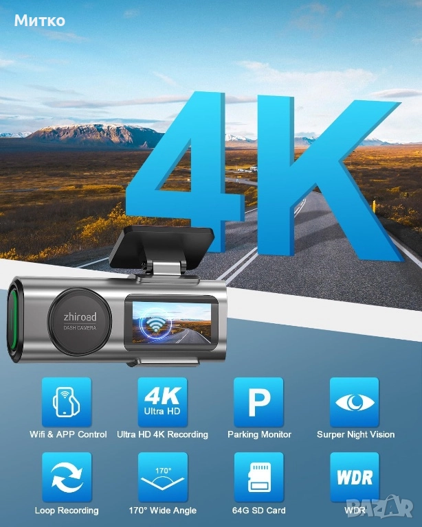 видеорегистраторна камера Zhiroad 4K (3840*2160P) Ultra HD, заснемаща видео със зашеметяваща резолюция. 4k видеорегистраторът разполага с обектив със 170-градусов ъгъл за максимално покритие, което ви позволява да видите всяко пътно състояние и регистрационен номер. Предната ни камера заснема живо моментите по време на шофиране, предоставяйки подробни доказателства.