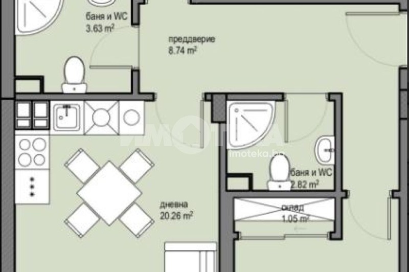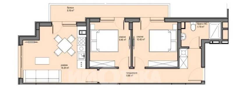 Тристаен апартамент със застроена площ от 68.49 кв.м. Състои се от: преддверие, трапезария с кухненски бокс, самостоятелни спални 2 бр, баня с тоалетна и балкон. Има възможност за закупуване на подземни паркоместа.