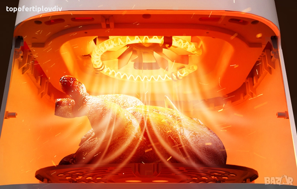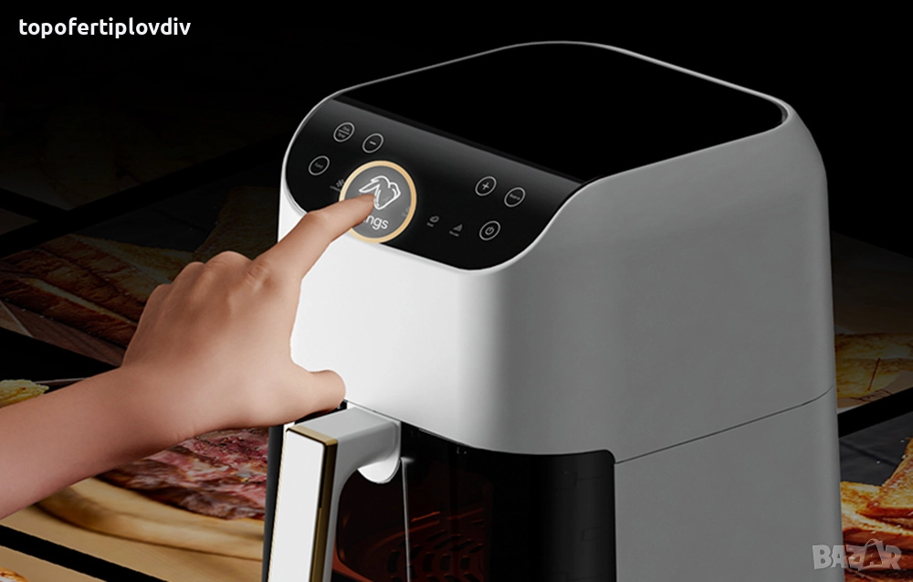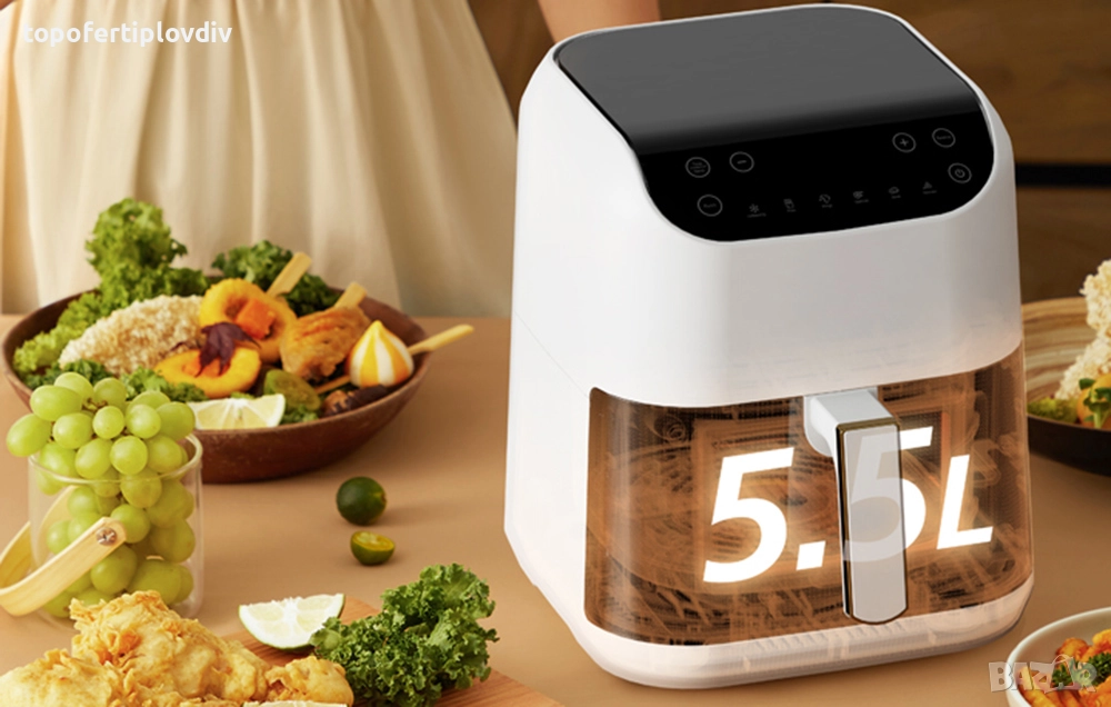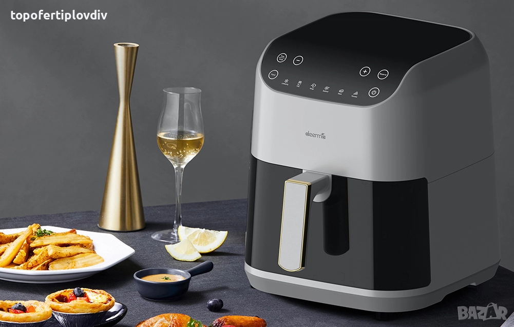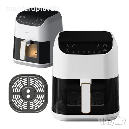 Deerma DEM-KZ130W е фритюрник без мазнини с голям капацитет от 5,5 литра, в който можете да приготвите дори цяло пиле. Устройството предлага 6 програми, които имат избрани температури и време за готвене за вида храна. Можете също така да ги променяте по желание. Фритюрникът ви позволява да виждате целия процес благодарение на вграденото стъкло - вече не е необходимо да отваряте или изключвате устройството, за да проверите състоянието на храната. Друго предимство е автоматичното планиране на времето за печене до 24 часа предварително.