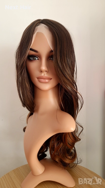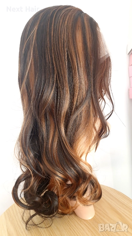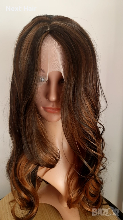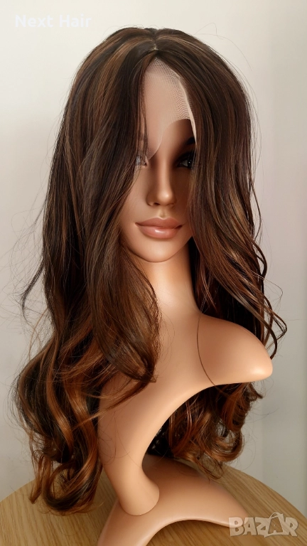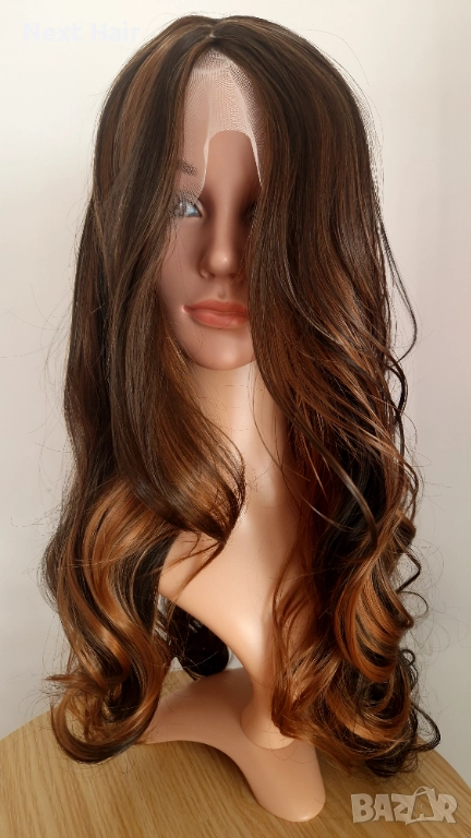 Парти тъмно кафява синтетична перука с руси кичури, на път, 65 см → Обява 52813656