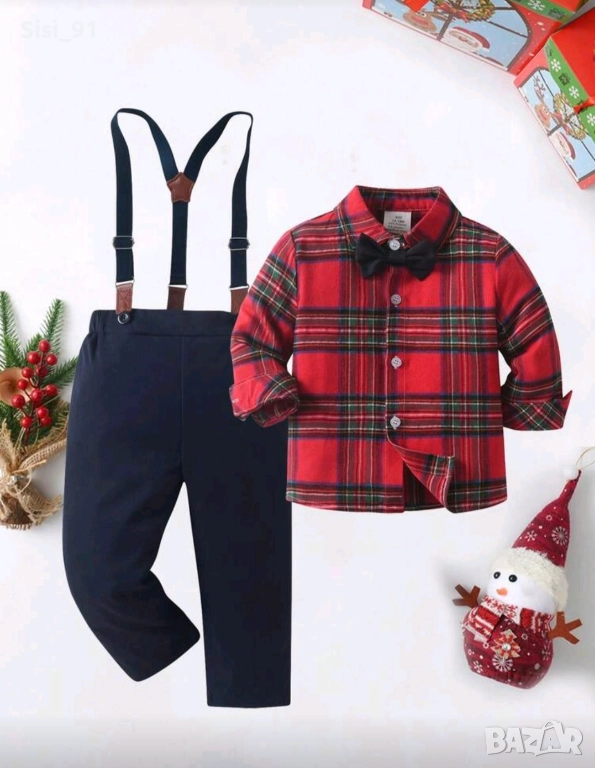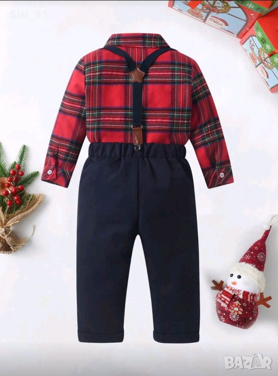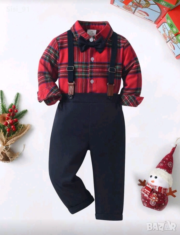 Нов комплект размер 18-24 месеца, състоящ се от риза, панталон, тиранти и папийонка.