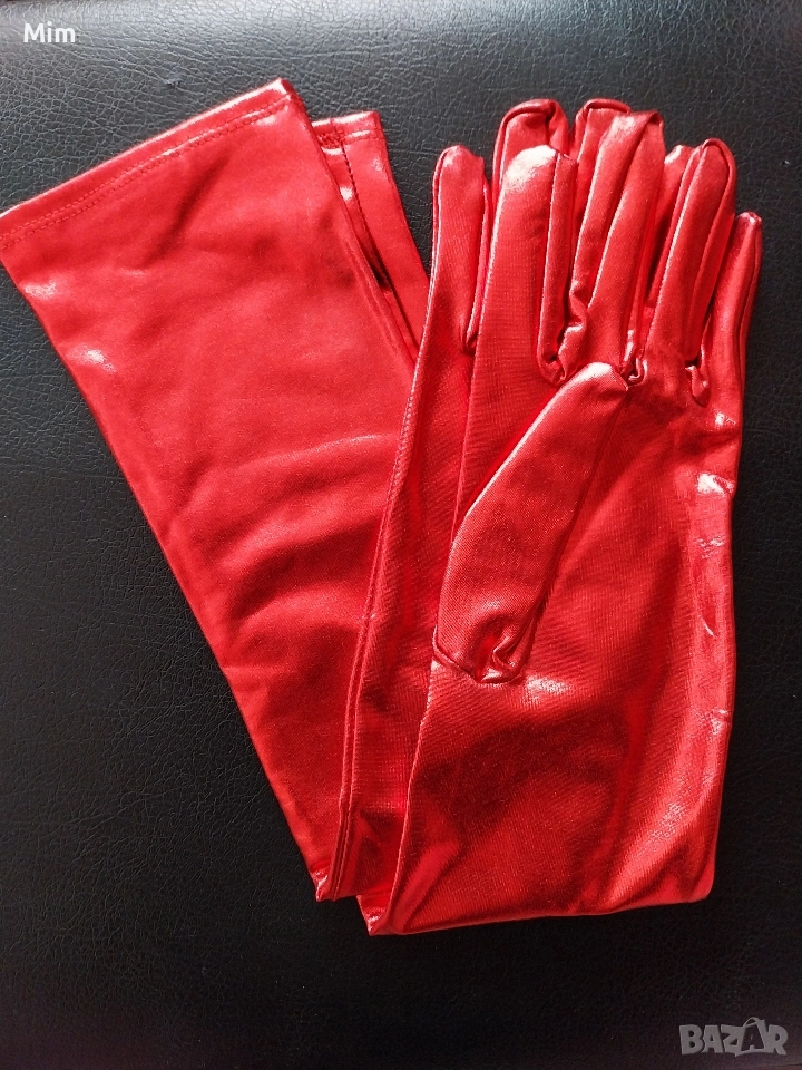 4-Червени ръкавици с пет пръста имитиращ еко еко / лак / д,дължина 50 см еднаква материя като чорапите -цена 15 лв