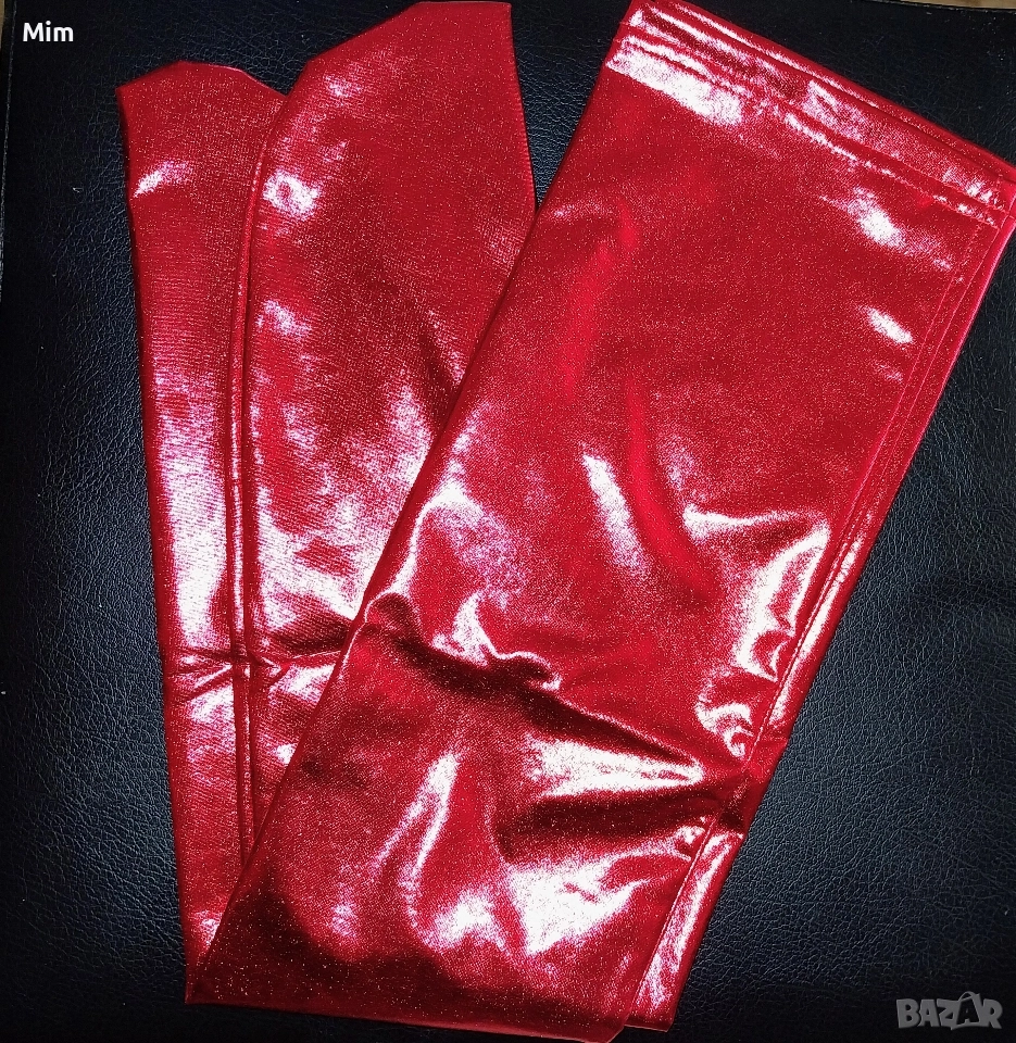 3- Дамски червени еластични чорапи от еко кожа имитират лак ,дължина 67 см без стъпало, б бедрото 30 см до 40 см.