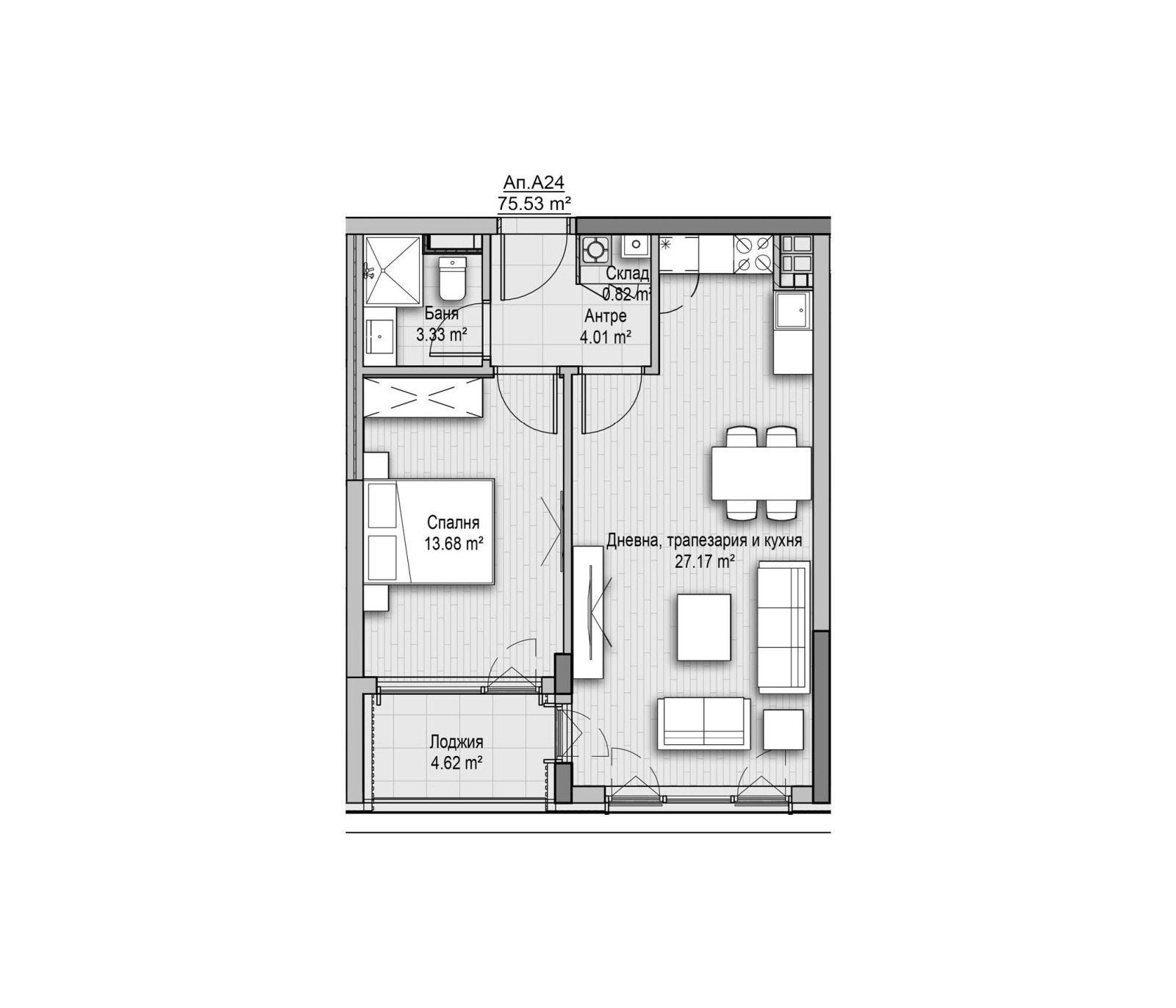 - Светла дневна с кухненски бокс, спалня, баня с тоалетна, входно антре, лоджия.