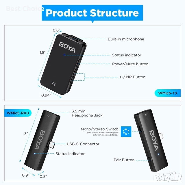 Ултракомпактни 2.4GHz двуканални безжични микрофонни BOYA WMic5