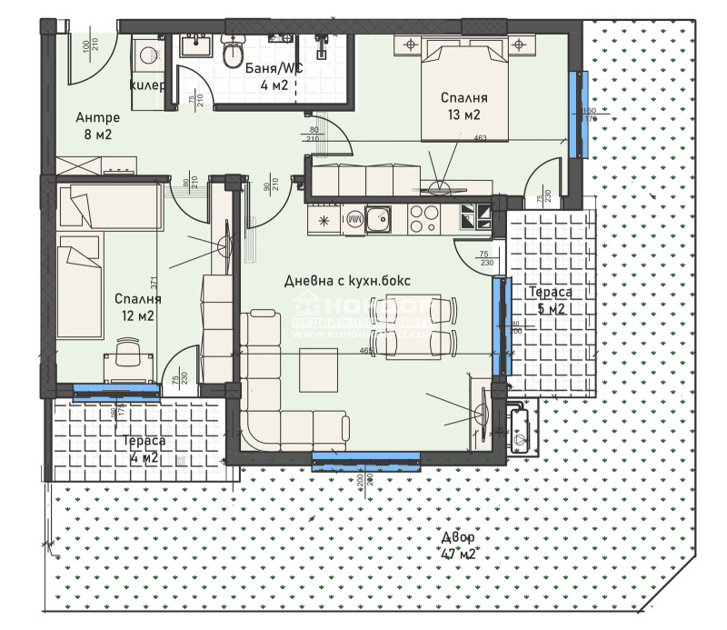 Оферта 68512 - Бутиков затворен жилищен комплекс с модерна и устойчива архитектура, потопена в богато озеленени площи, вдъхващи на живущите комфорт и спокойствие. Комплекса предлага просторна спокойна среда с бърз достъп до центъра на града, както и възлови булеварди. Предлагаме ви тристаен апартамент, състои се от ъглова югоизточна дневна с трапезария и кухненска част, две самостоятелни спални, баня с тоалетна, втора тоалетна, входно антре с място за перално, две веранди и озеленен двор. В близост са ситуирани ресторанти, хипермаркети, училища и детски градини. Ще бъдат изградени луксозни общи части с предоставено облагородено дворно място, пейки за отдих и детски площадки за игра.