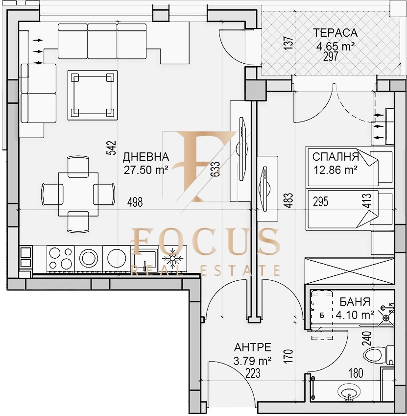 Разпределение: антре, дневна с кухненски бокс, спалня, баня с тоалетна и тераса.