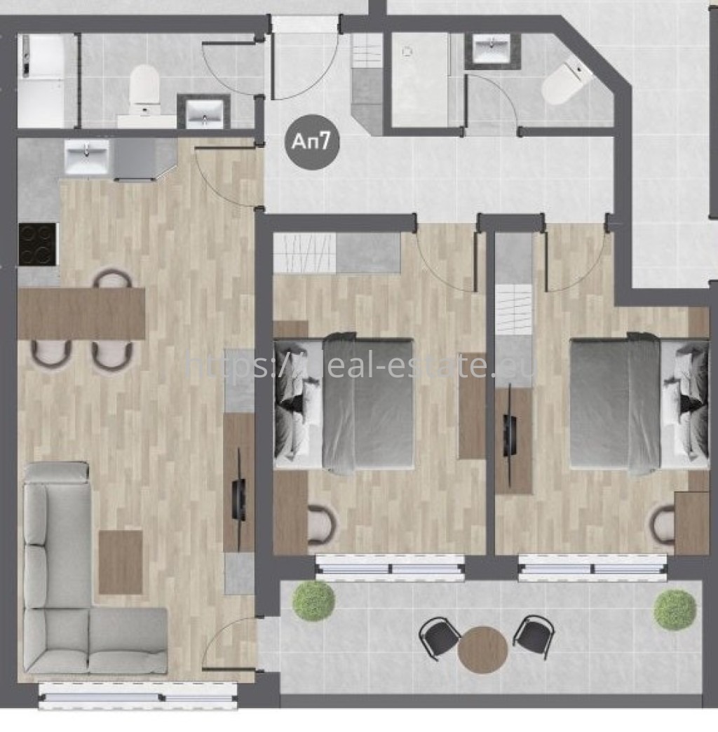 - коридор, дневна с кухненски бокс с панорамни прозорци и гледка към града, две спални, два санитарни възела и тераса.