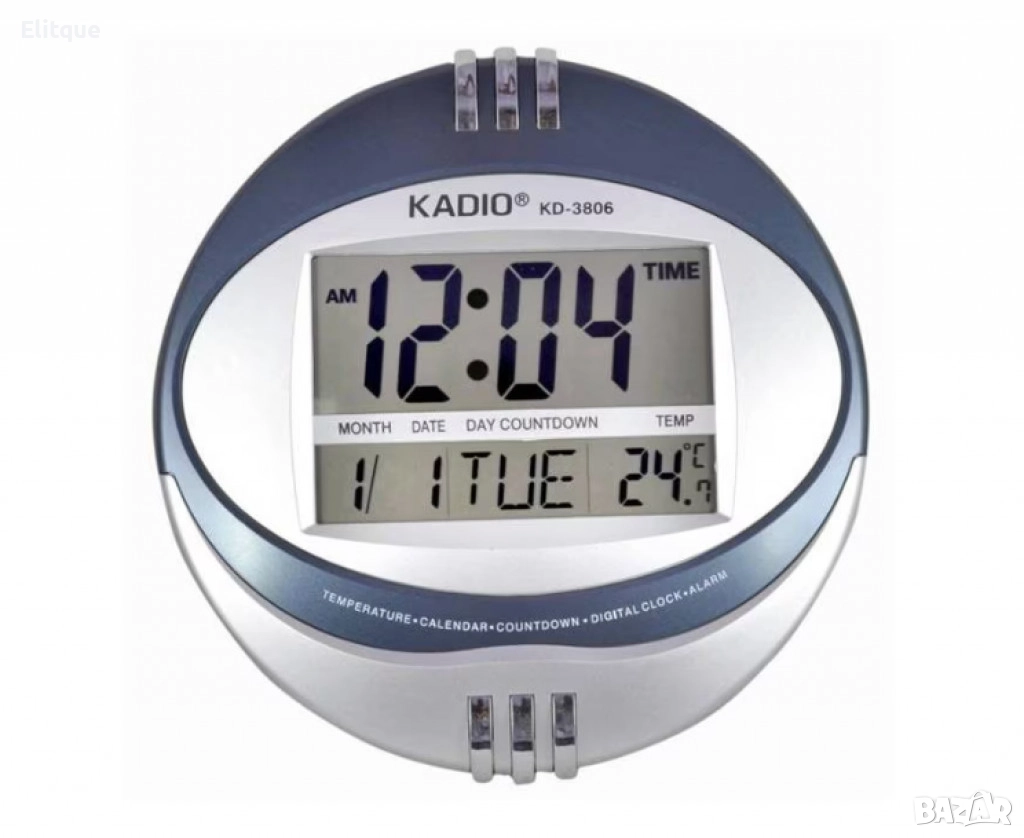 Дисплей: Цифров, показва час, минута, месец, ден, делничен ден, температура;
