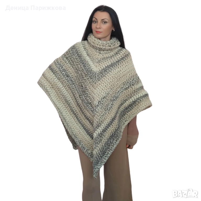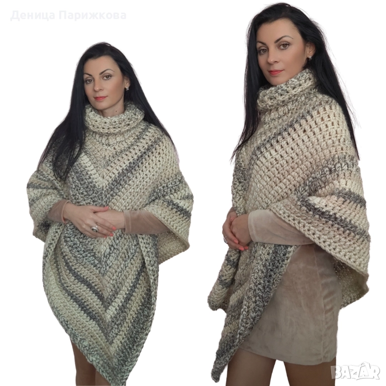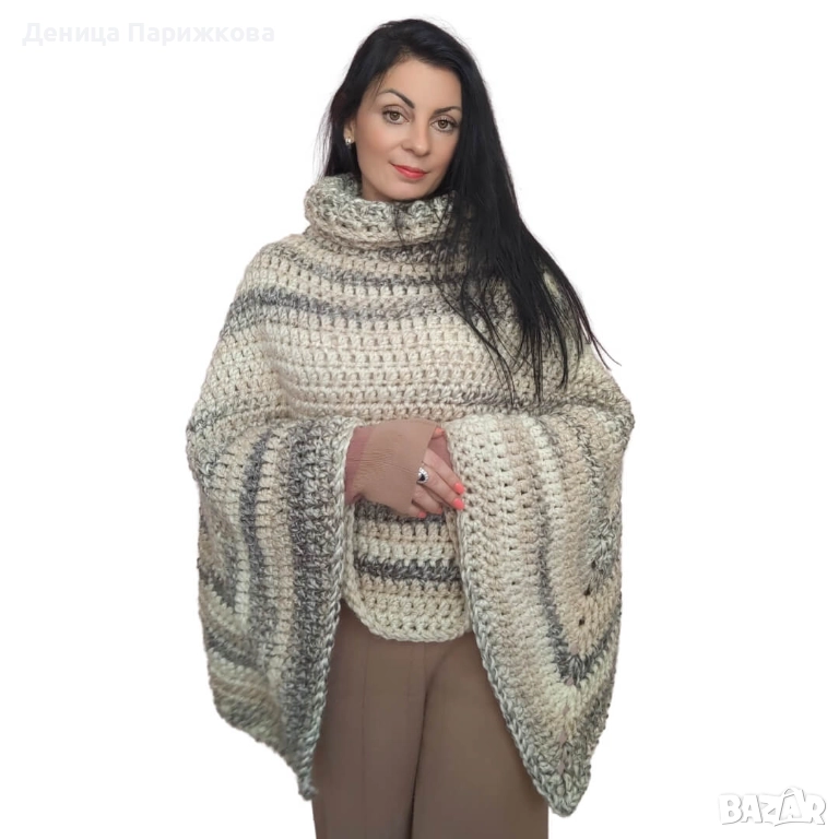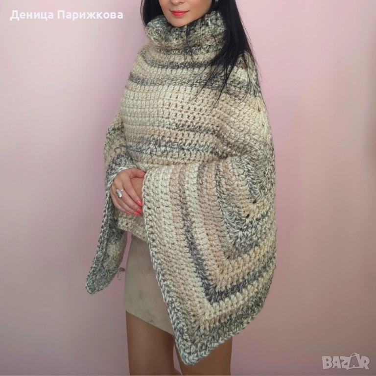 Ръчно плетено пончо с поло яка