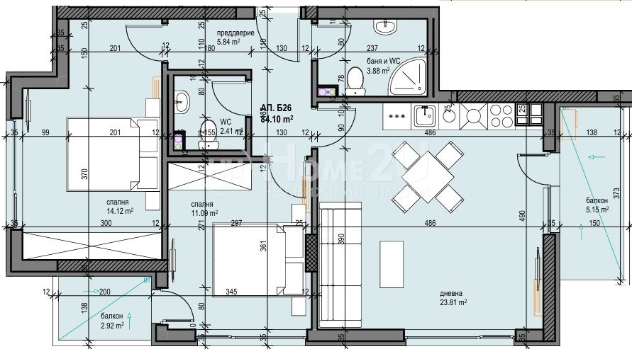 Home2U предлага тристаен апартамент на 8 ми етаж от 9, с площ от 102 м2 , разпределени във входно антре, всекидневна с кухненски бокс и излаз на тераса, две спални, като едната е с излаз на тераса, баня с тоалетна и мокро помещение. Апартаментът е светъл, с правилни форми и открита, нескриваема гледка.