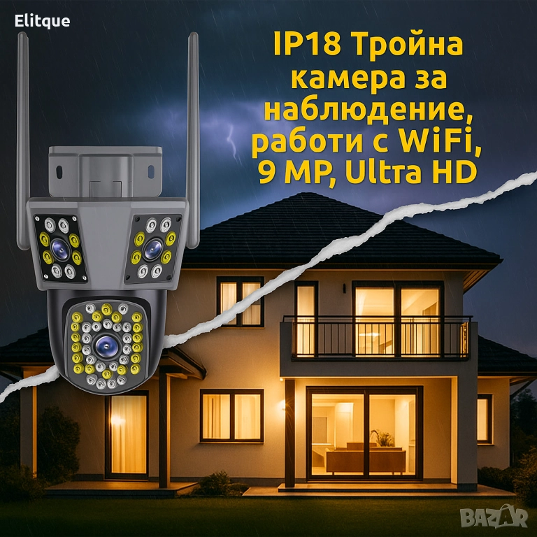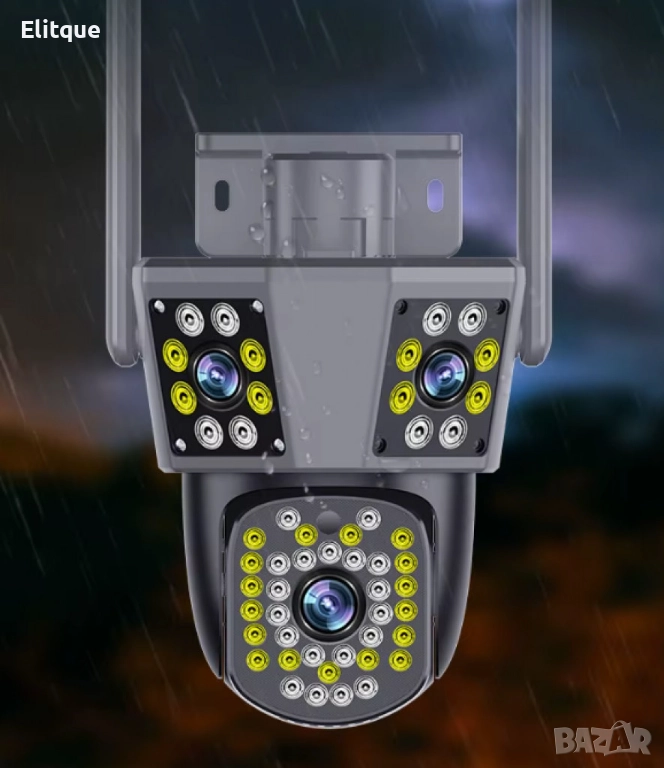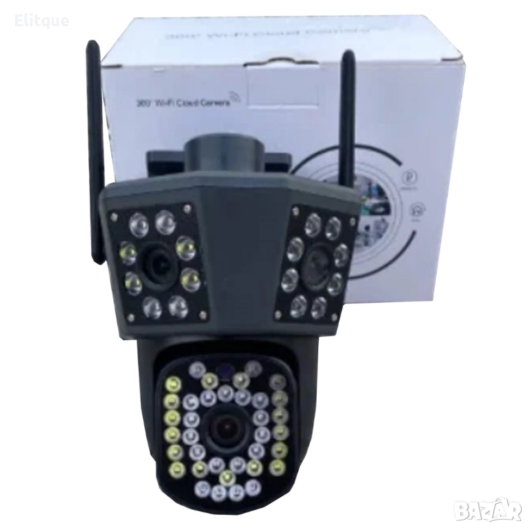 Тройна WiFi Smart камера за наблюдение. Kарта връзка предлага висока резолюция от 9 MP и Ultra HD качество на изображението. Подходяща както за вътрешно, така и за външно използване, камерата разполага с 5-кратно оптично увеличение (Zoom) и ротационна функция за 360° панорамен изглед. Оборудвана е с LED светлина за нощно виждане, сензор за движение и алармена система за засичане на нежелани обекти. Камерата се захранва чрез DC-12V и поддържа както WiFi свързаност за лесно управление и наблюдение на живо през мобилно устройство.