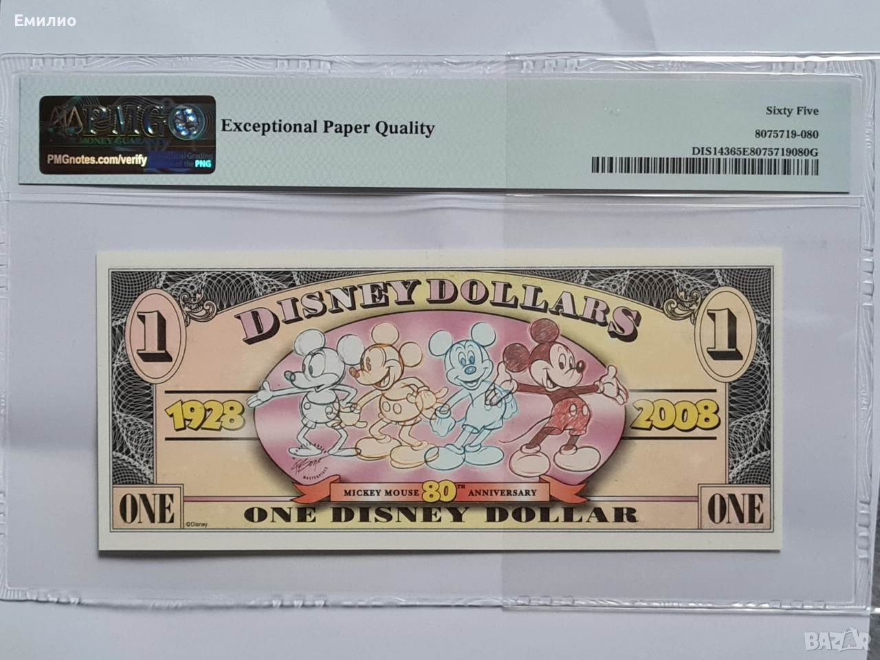 Един Дисни Долар от 2008 год. Банкнотата е Сертифицирана от PMG с оценка 65