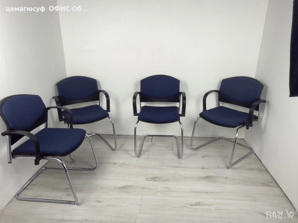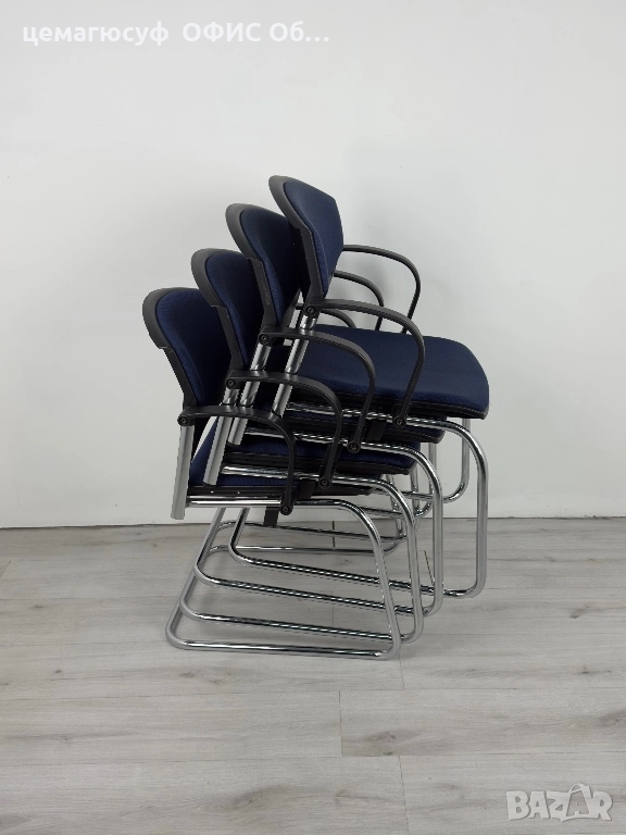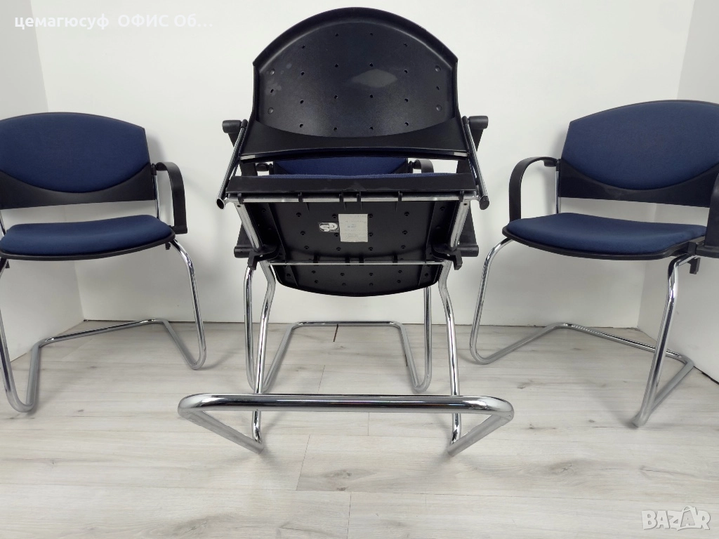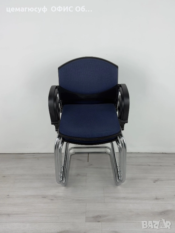 офис столове в тъмносин цвят. Подходящи за конферетни зали или срещи . Стабилна хромирана метална конструкция и удобни седалки. Могат да бъдат добро решение за обзавеждане на вашето работно пространство.
