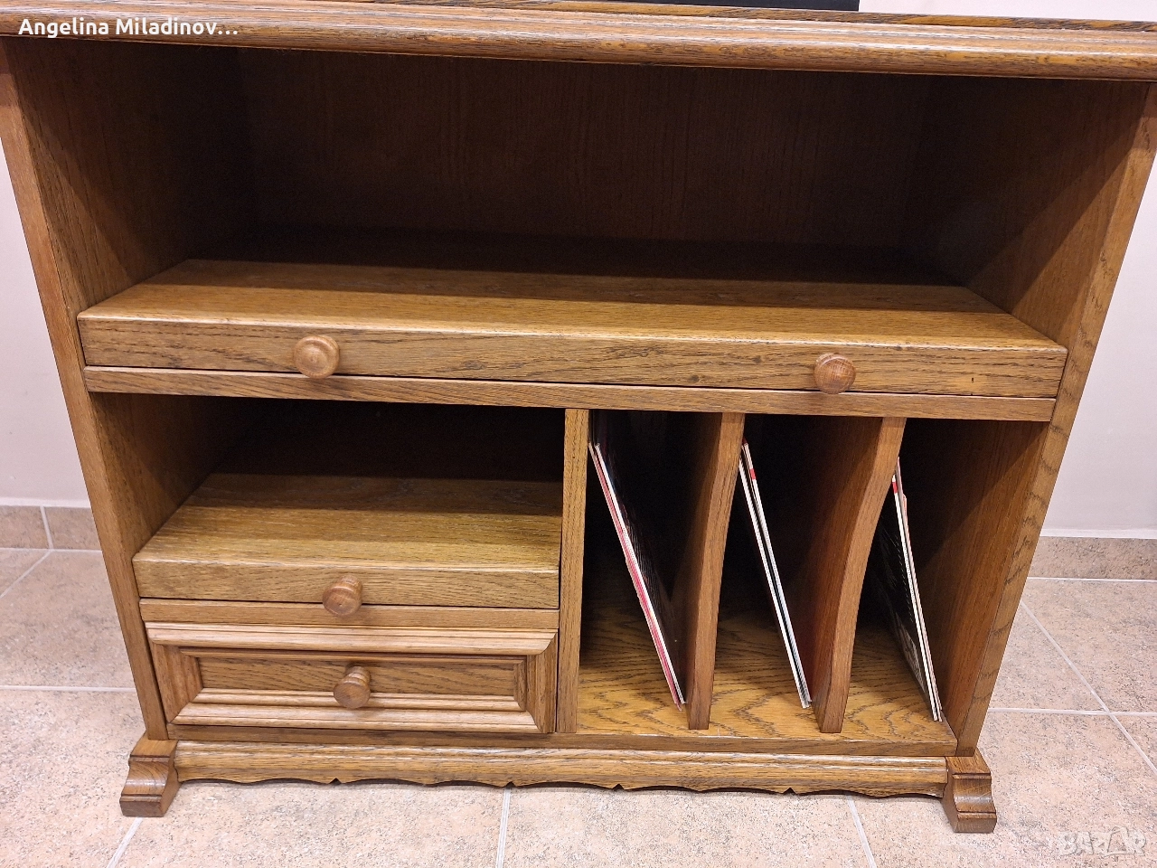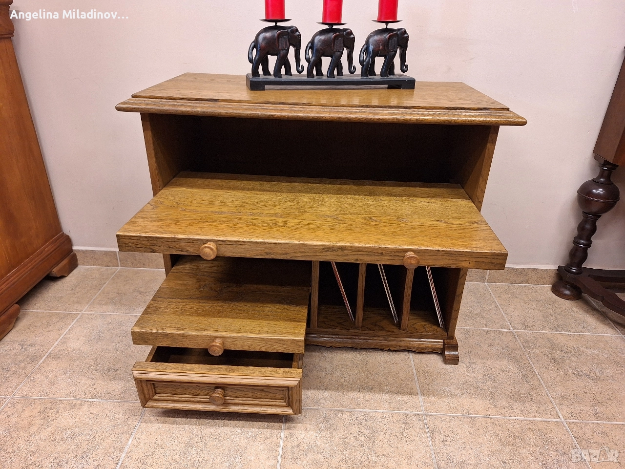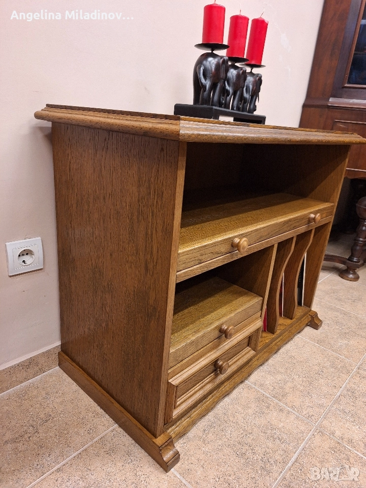 TV шкаф с подвижни плотове. Винтидж TV шкаф дъб. Практична и удобна мебел. Отделения за плочи, дискове, практично чекмедже и подвижни плотове за телевизор, грамофон или друга техника. Приятни извивки допълват красотата на шкафа. Отлично състояние. Разгледайте и другите ми обяви. Последвайте ни и във фейсбук Мебели шик. Предлагаме и изгоден транспорт за цялата страна. Размери: Дължина - 89 см .Ширина - 43 см .Височина - 70 см .Цена - 150 €. 293,37 лв.
