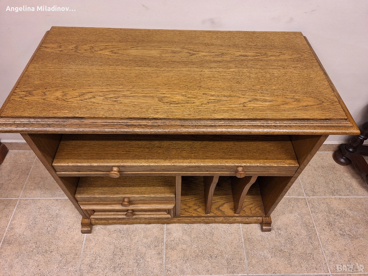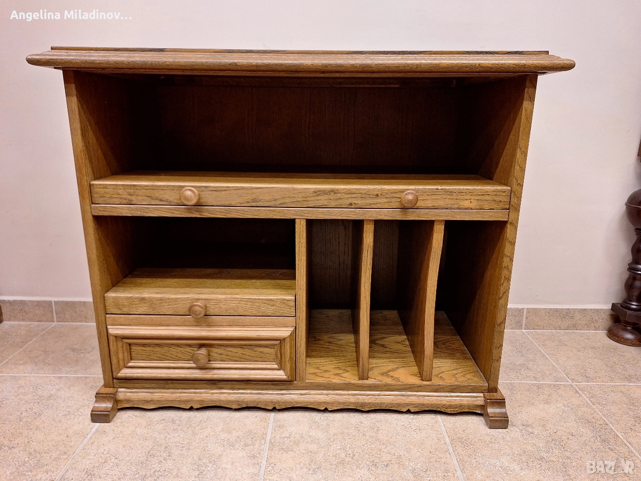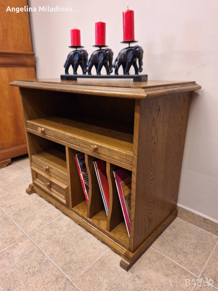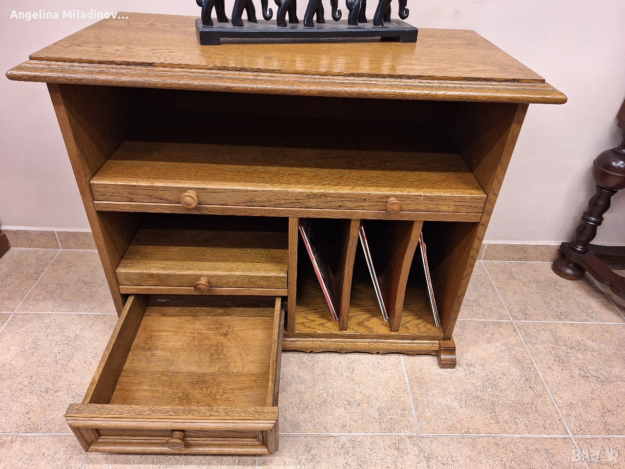 TV шкаф с подвижни плотове. Винтидж TV шкаф дъб. Практична и удобна мебел. Отделения за плочи, дискове, практично чекмедже и подвижни плотове за телевизор, грамофон или друга техника. Приятни извивки допълват красотата на шкафа. Отлично състояние. Разгледайте и другите ми обяви. Последвайте ни и във фейсбук Мебели шик. Предлагаме и изгоден транспорт за цялата страна. Размери: Дължина - 89 см .Ширина - 43 см .Височина - 70 см .Цена - 150 €. 293,37 лв.