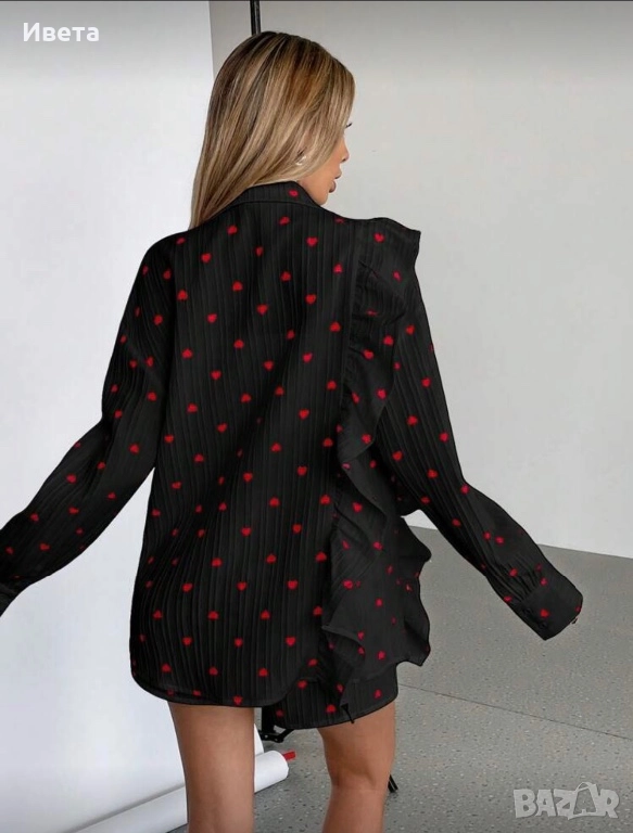 Страхотен дамски костюм комплект на сърца. Къси панталони и риза с дълъг ръкав