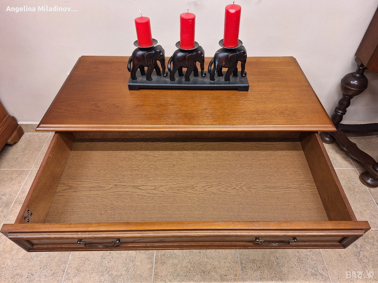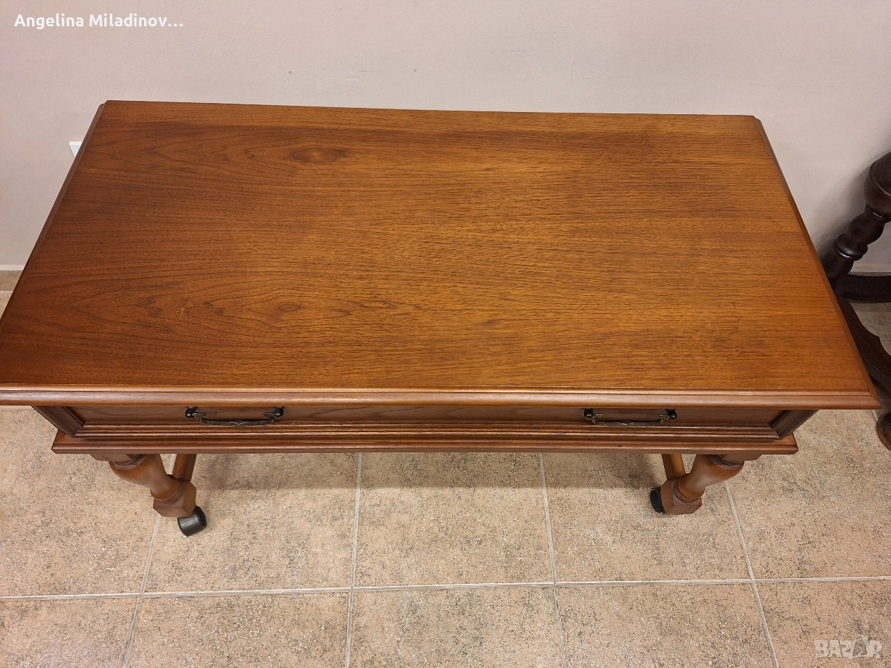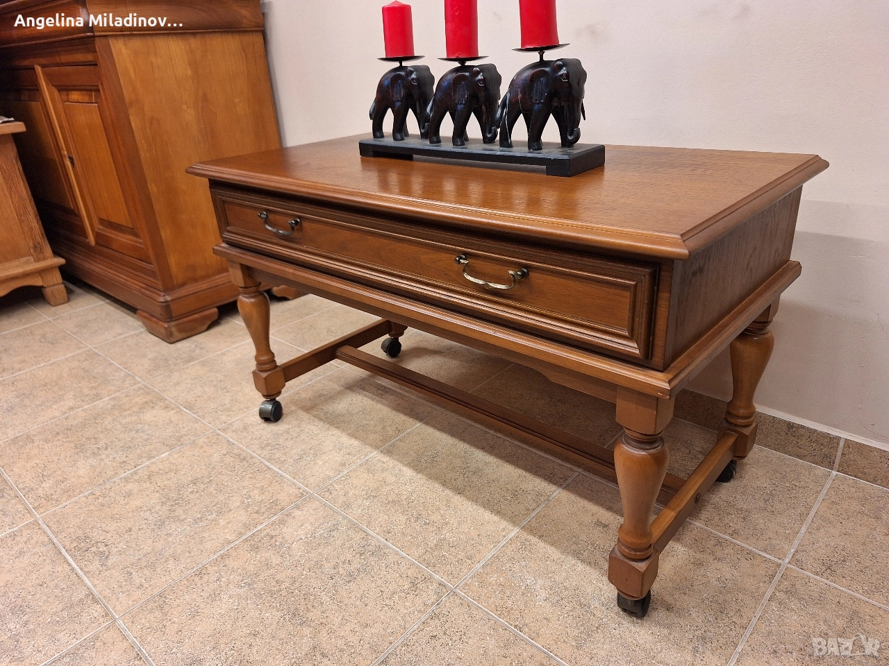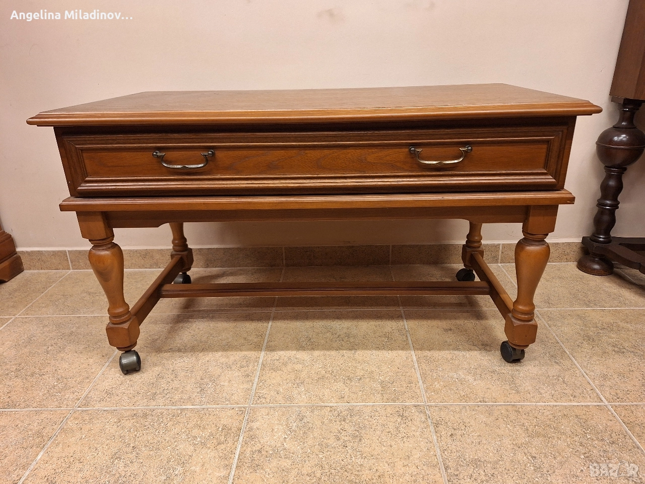 Маса за всекидневна с колелца. Интересна маса за всекидневна с голямо практично чекмедже и колелца. Масивни месингови дръжки и резбовани крачета допълват винтидж стила. Отлично състояние. Разгледайте и другите ми обяви. Последвайте ни и във фейсбук Мебели шик. Предлагаме и изгоден транспорт за цялата страна. Размери: Дължина - 95 см. Ширина - 46 см. Височина - 55 см. Цена - 75 €. 146,69 лв.