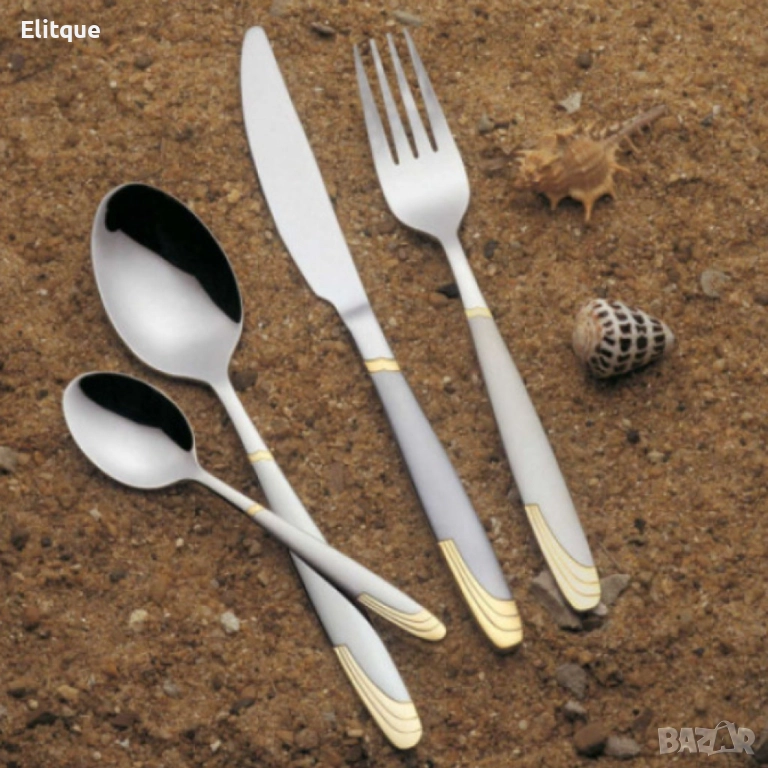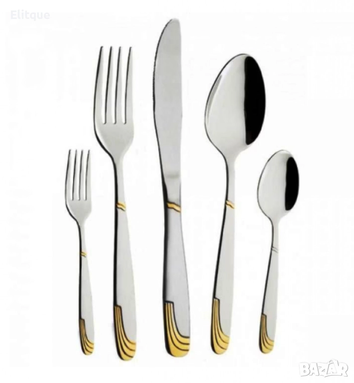 Съдържание на комплекта: 6 бр. вилици за основно ястие, 6 бр. лъжици за основно ястие, 6 бр. ножове за основно ястие, 6 бр. чаени лъжички, 6 бр. десертни вилички;