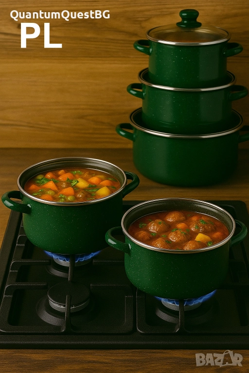 Подобрете готварския си опит с комплекта от 5 тенджери с високо качество и стилно зелен емайлирано покритие. Този комплект е идеален както за домашна, така и за професионална употреба.