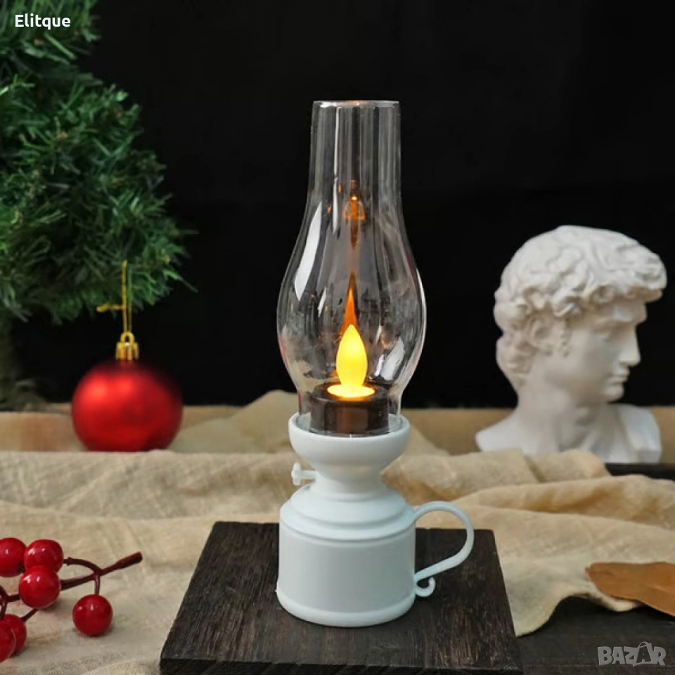 Тип: LED декоративна винтидж лампа; Размери: 13,5 x 5,5 см (5,31 x 2,16 инча); Светлина: топла, трептяща (ефект на свещ); Захранване: батерии (включени в комплекта); Материали: пластмаса и прозрачен корпус; Цветове: бял, черен, бронз; Безопасност: без нагряващи елементи, подходяща за деца; Приложение: коледна украса, романтична вечеря, домашен декор; Гаранция: 12 месеца.